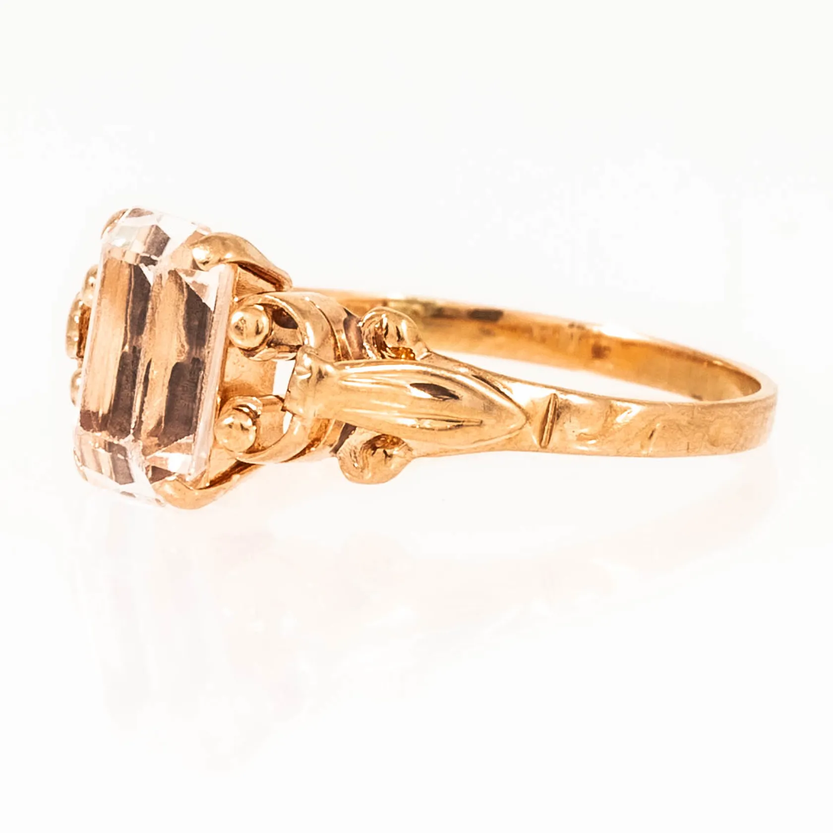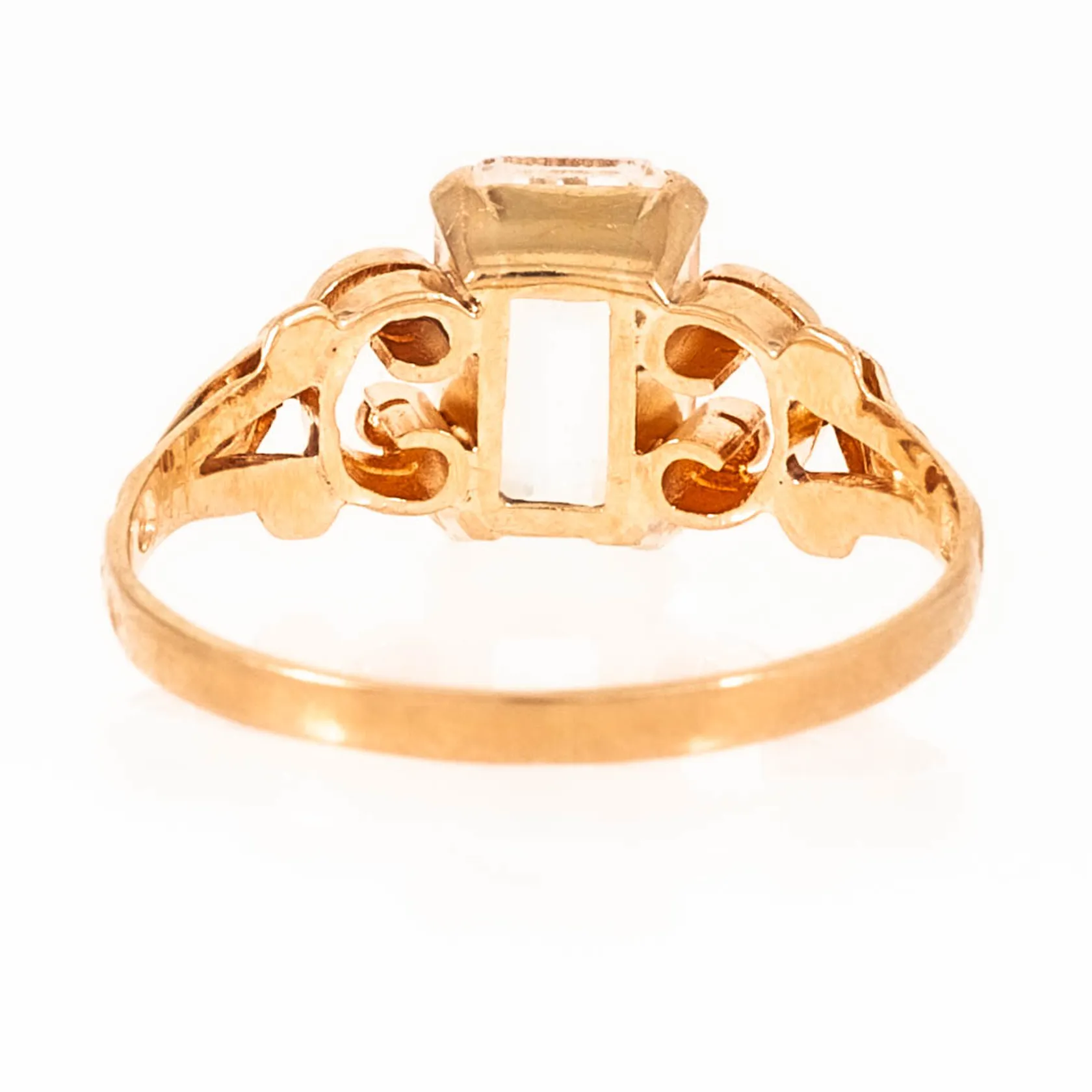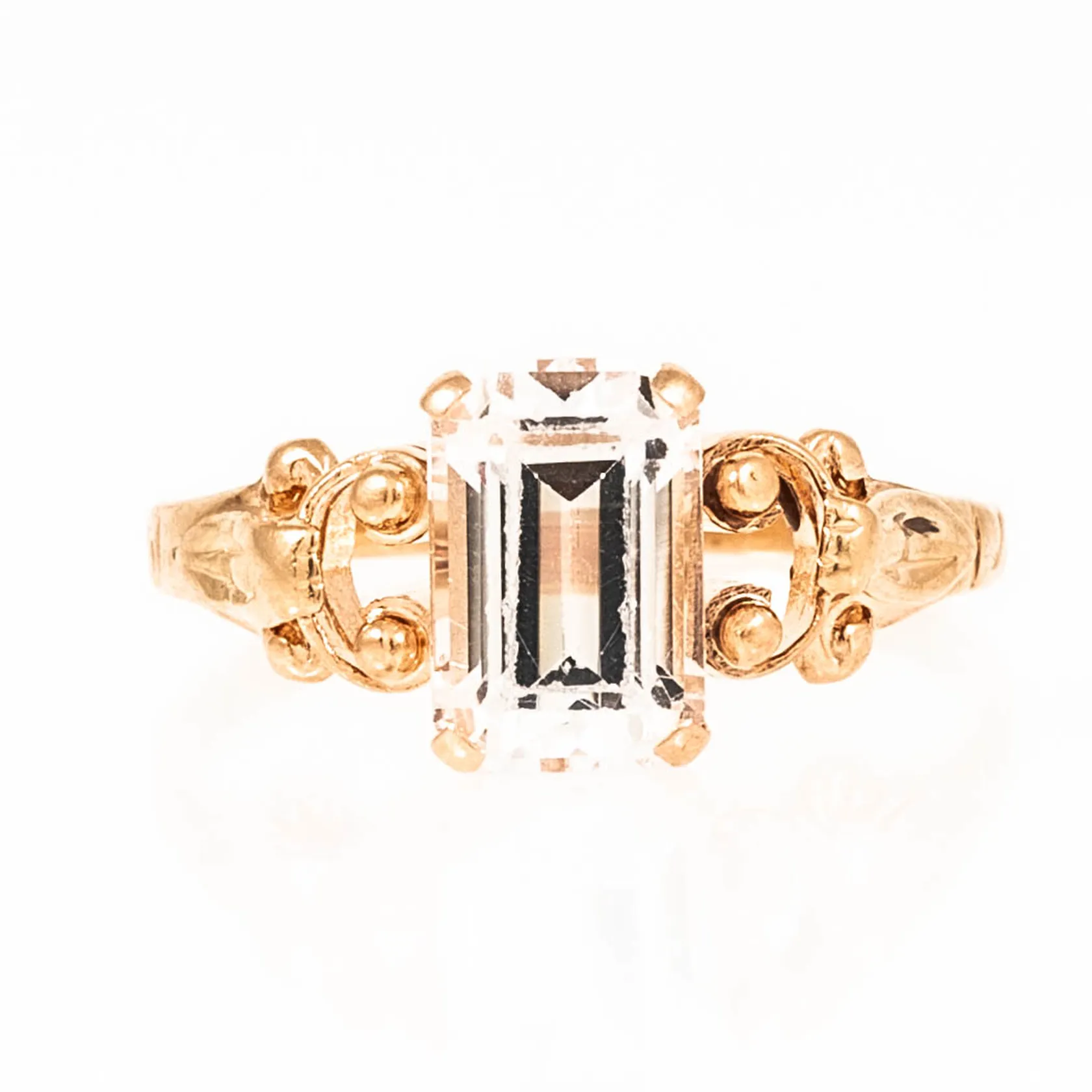 Ring i 18K guld med vit sten 9 x 6 mm (sannolikt syntetisk spinell). Den är i storlek 18, är 1,5 - 9 mm bred och väger 2,4g. Naggade fasetter på sten men fin lyster ändå. Vikt: 2,4 g.