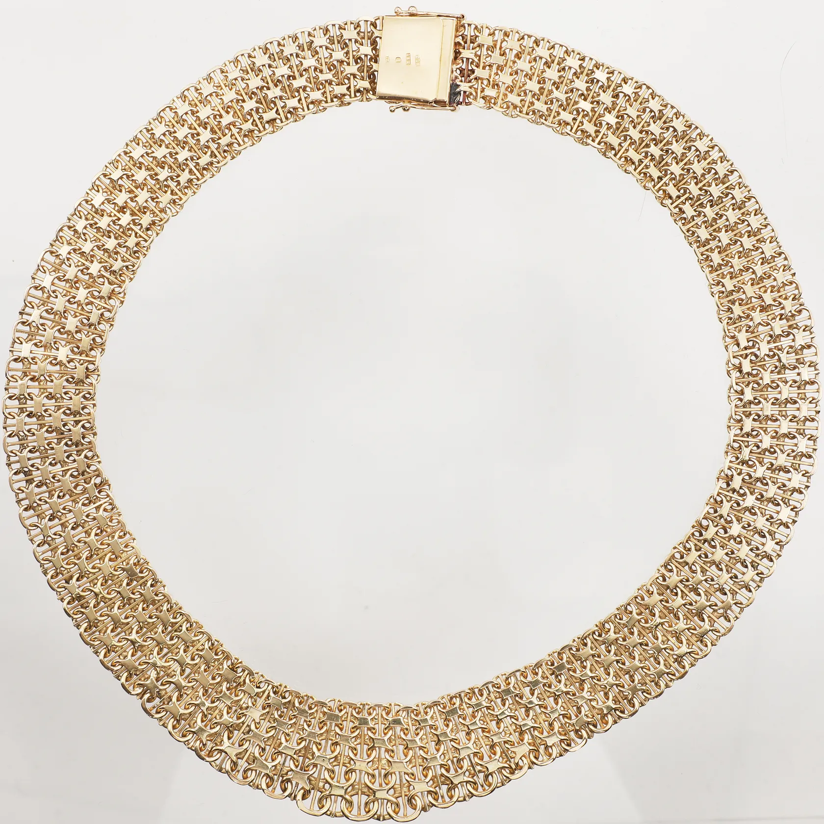 Collier X-länk med stav, doserad, längd 49cm, bredd 17,3-24,9mm, missfärgat vid lås, 18K Vikt: 119,4 g.