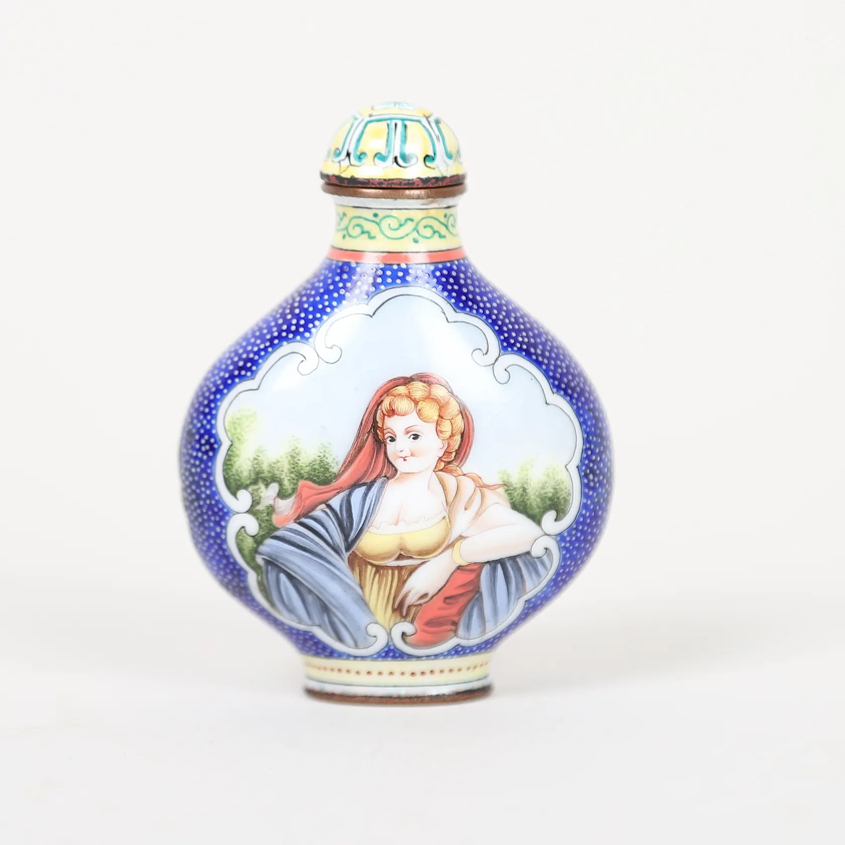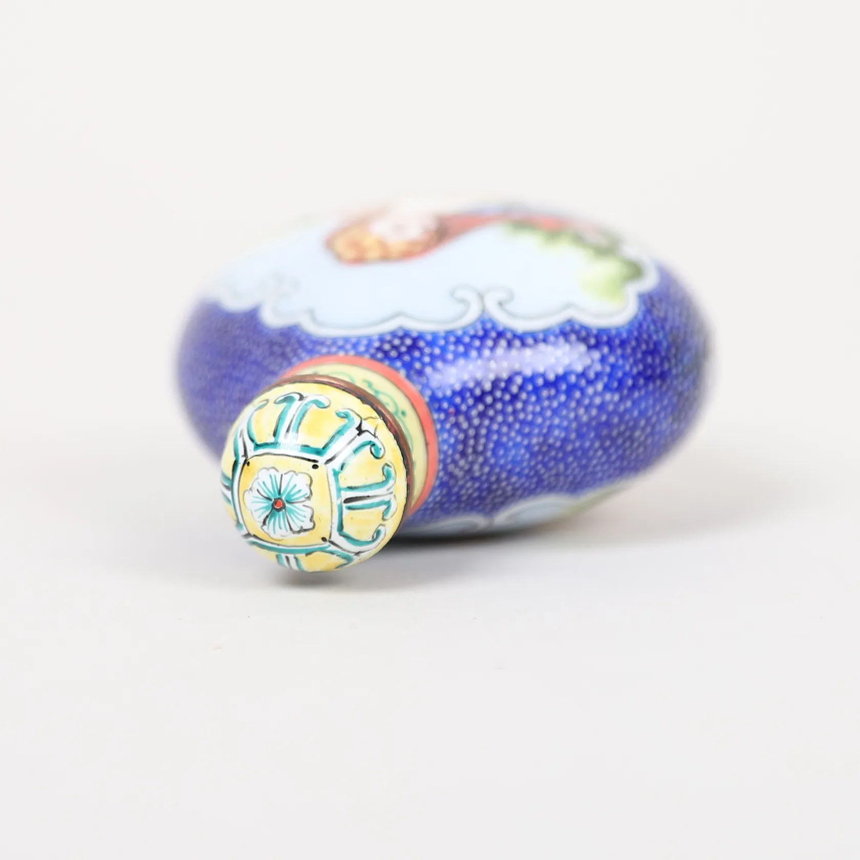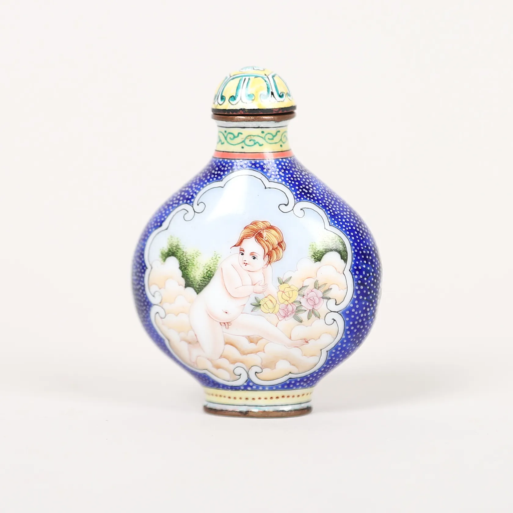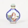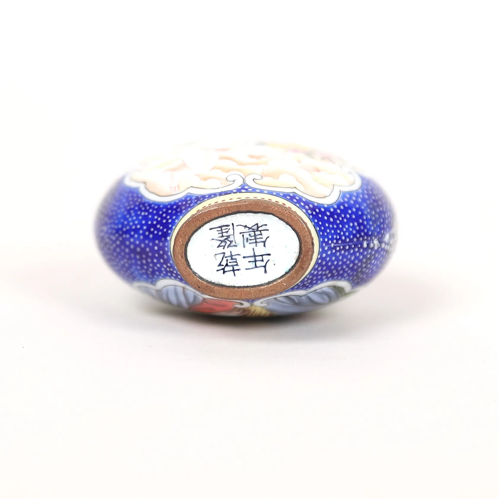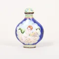 Snusflaska, emalj, Kina, med Qianlongs fyra karaktärers märke, tidigt 1900-tal, höjd 6,5cm, slitage, mindre emaljskador. lagad,