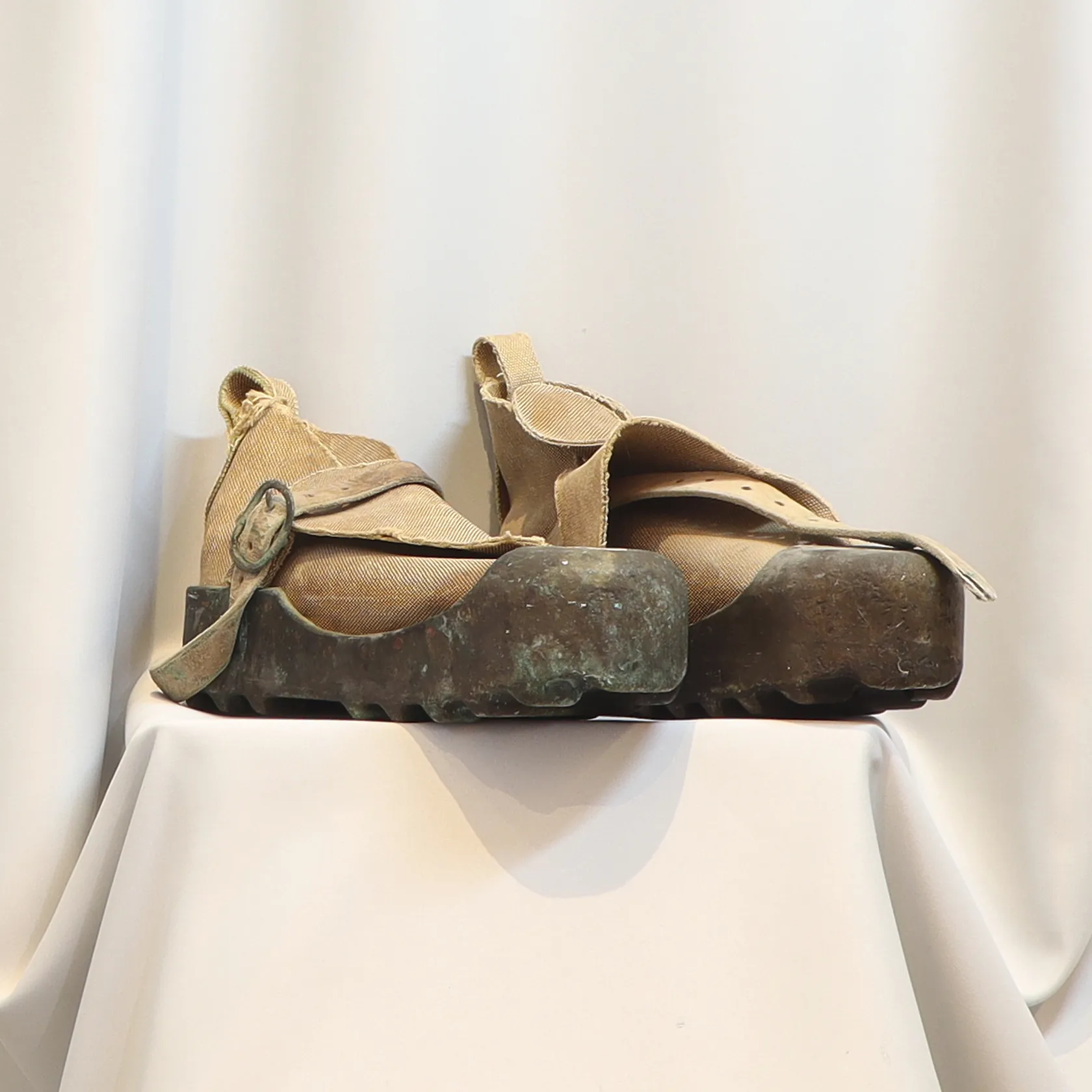 Tungddykarskor för Sveriges Armé märkta "Tre Kronor" nr. 47 omkring 1900-talets mitt, brons, impregnerad canvas och läder, hårt slitage, längd ca 34 cm, FINNS FÖR VISNING PÅ PANTBANKEN ÖSTERMALM Skickas med postpaket.