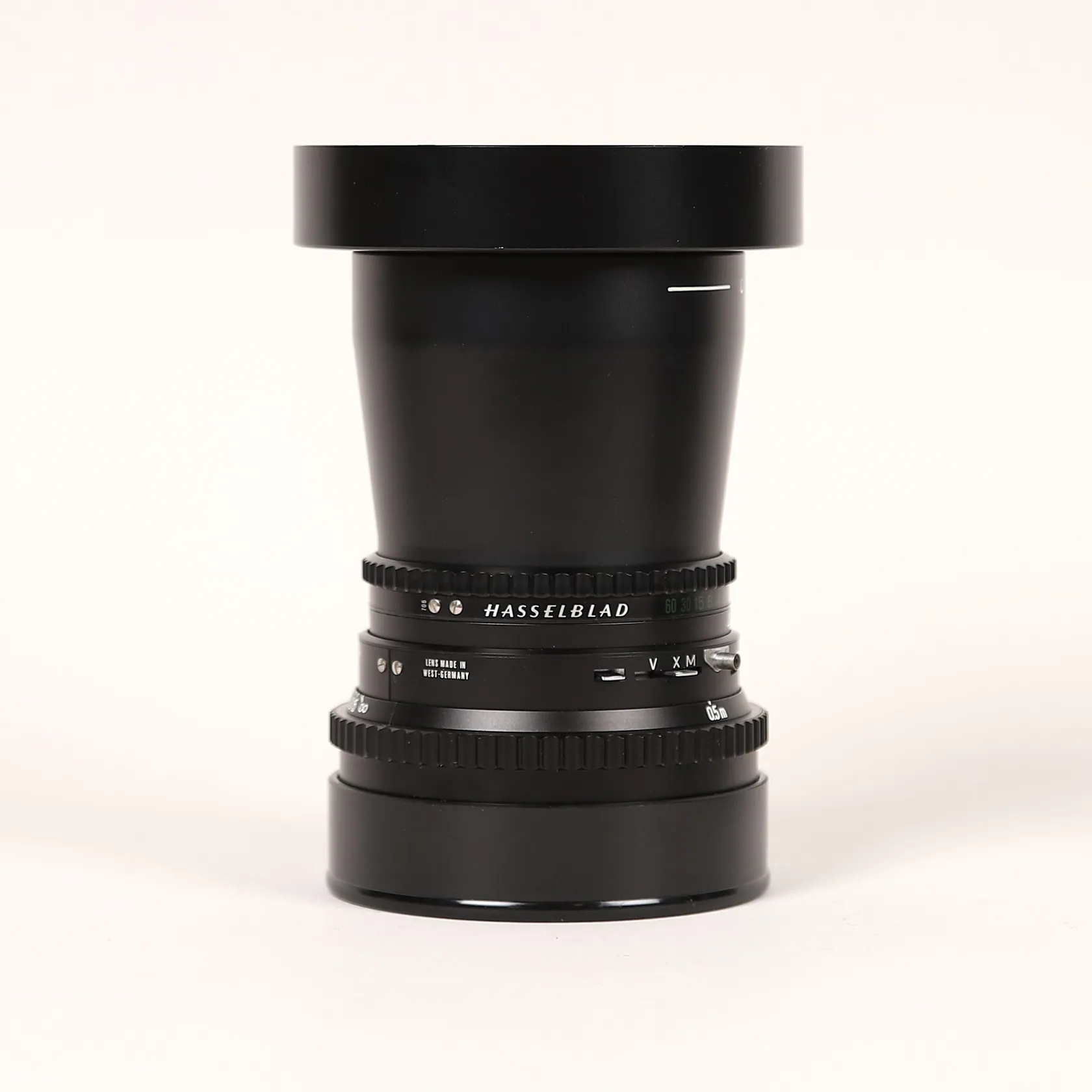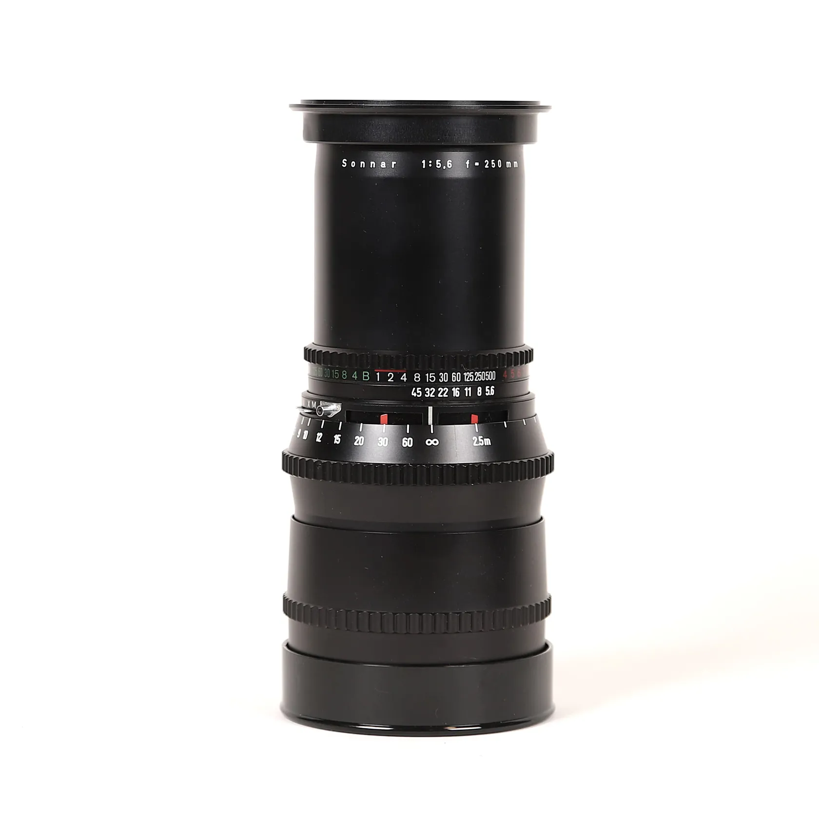 Kamerautrustning Hasselblad 500 C/M serienummer RS 1236729, 1980, med tre objektiv: Planar 1:3.5 f=100mm motjusskydd, Sonnar 1:5.6 f=250mm linsskydd bak, Objektiv Distagon 1:4 f=50mm linsskydd bak, axelrem samt två bakstycken, smärre bruksslitage, ytliga repor, objektiv planar 1:3,5 f=100 med mindre stötmärke på innersta linsen, ej funktionstestad.