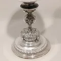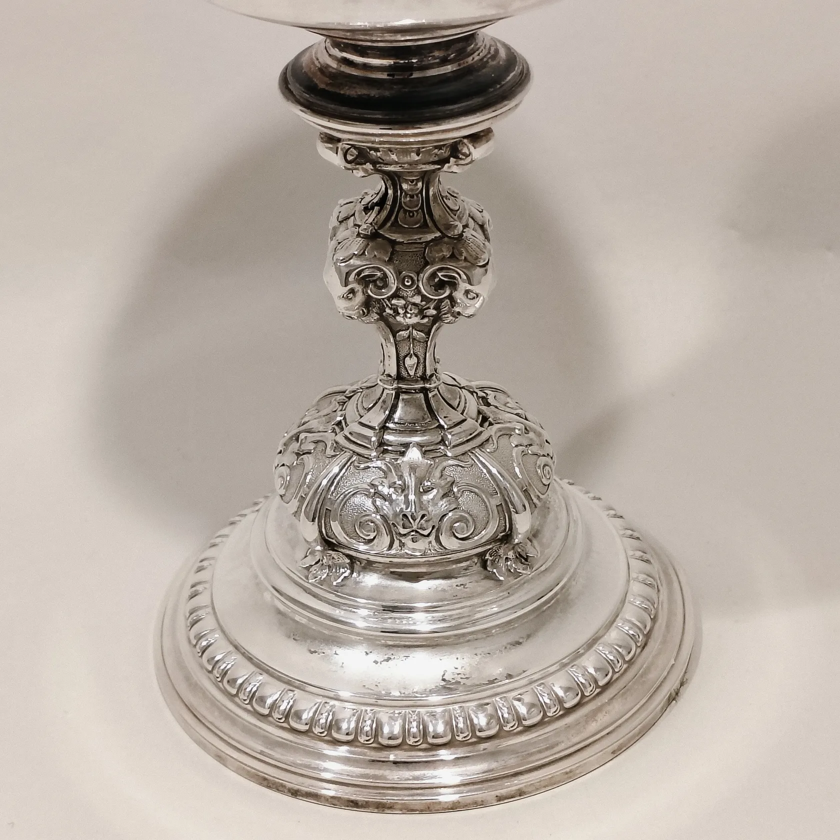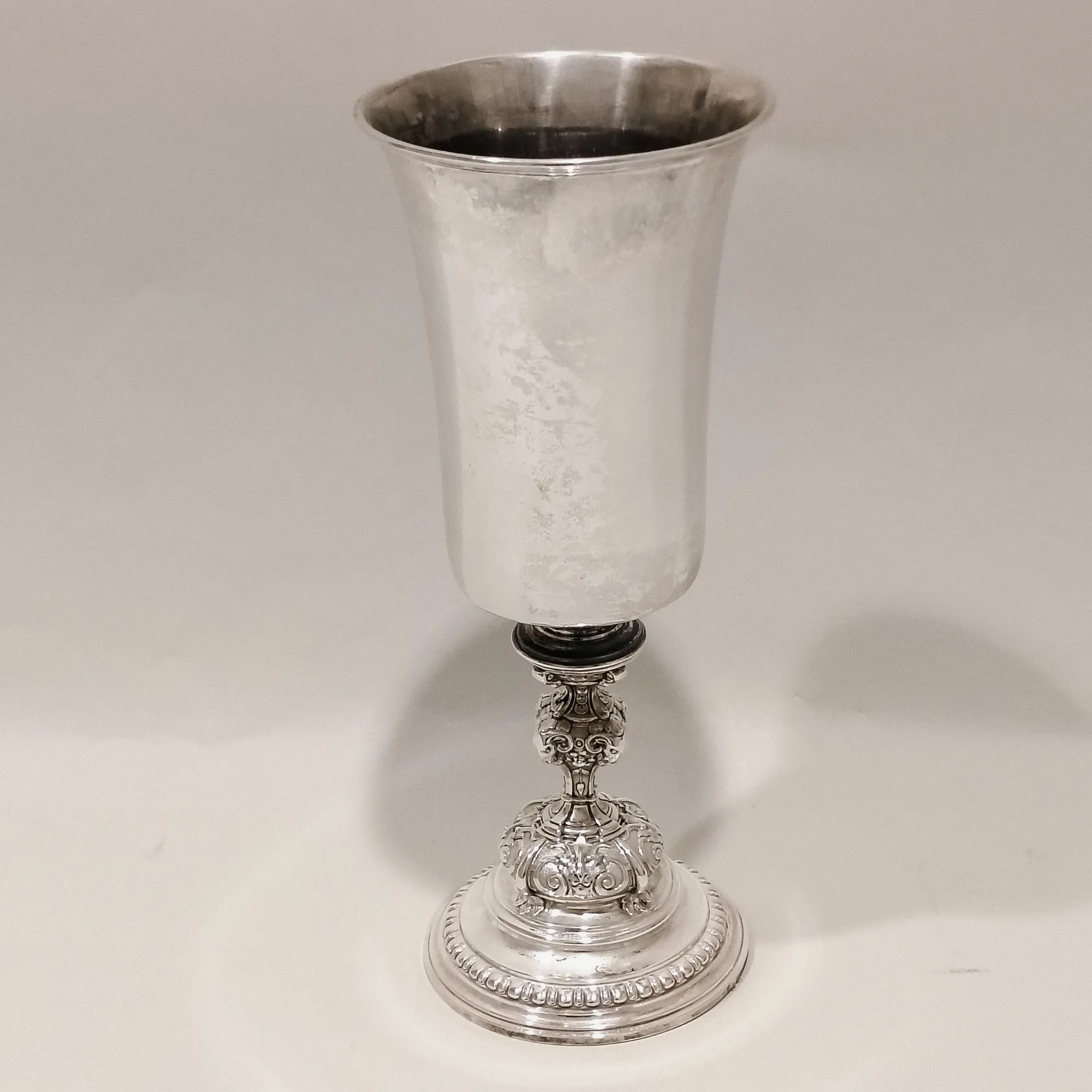 Pokal på fot med rik dekor av djurhuvuden i relief, personlig gravyr, höjd ca 25cm, Ø ca 9,5cm, C.F Carlman Stockholm sent 1800-tal, fylld botten, bruttovikt: 420,5g, 830/1000 silver Vikt: 420,5 g.