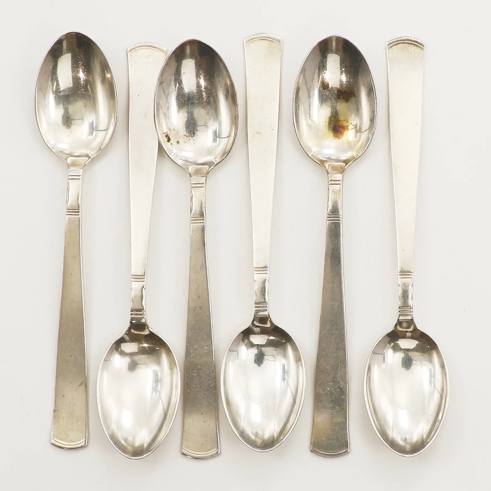 Sex kaffeskedar Rosenholm, längd ca 11cm, GAB, år 1951, 830/1000 silver Vikt: 68,9 g.