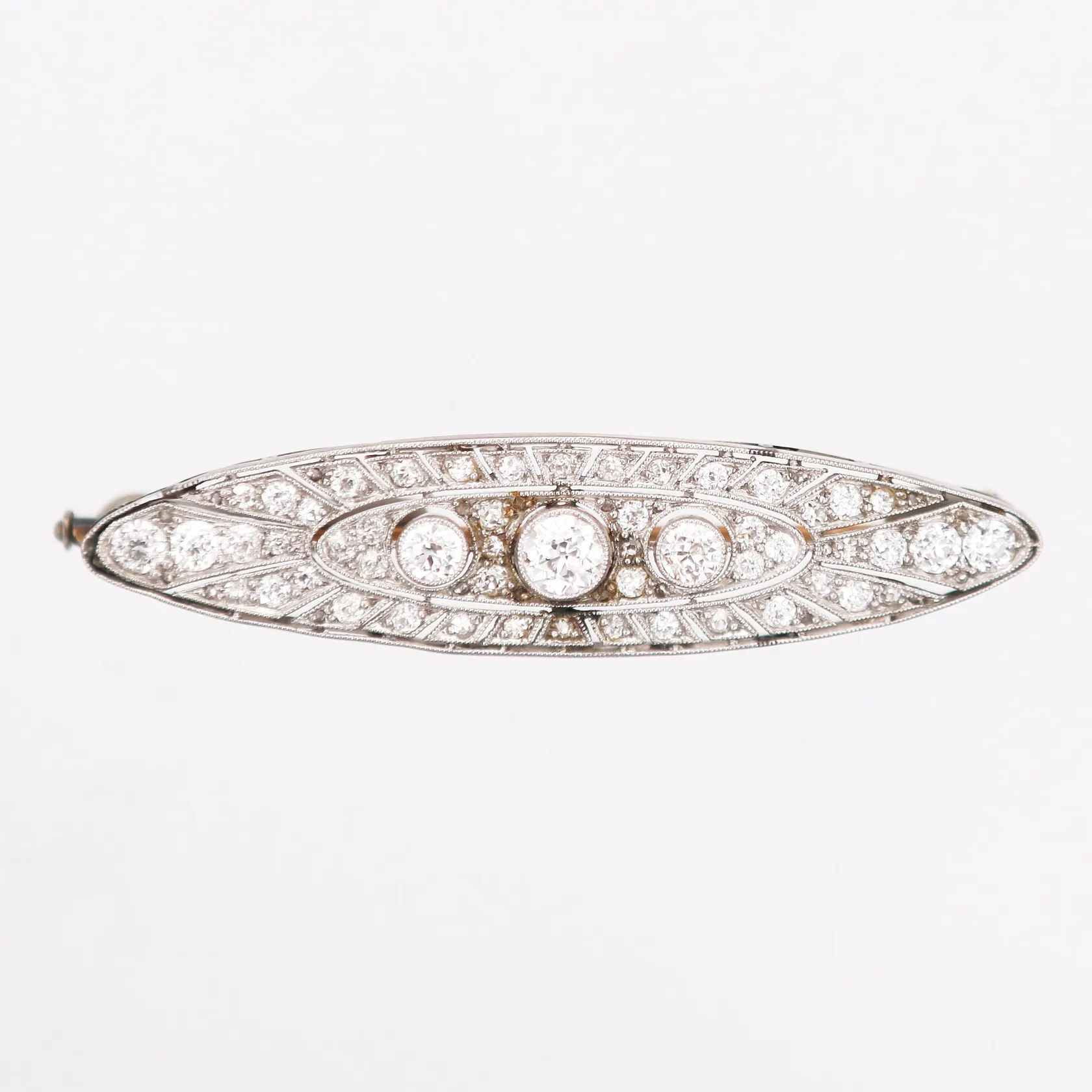 Brosch, Art Deco, ca 1930-tal med gammalslipade diamanter totalt ca 1,50 ctv, kvalitet ca TW-W(G-H)/VS-SI, längd 54mm, bredd 13mm, bucklig, platina samt 18K guld, vikt 7,0gr Vikt: 7 g.