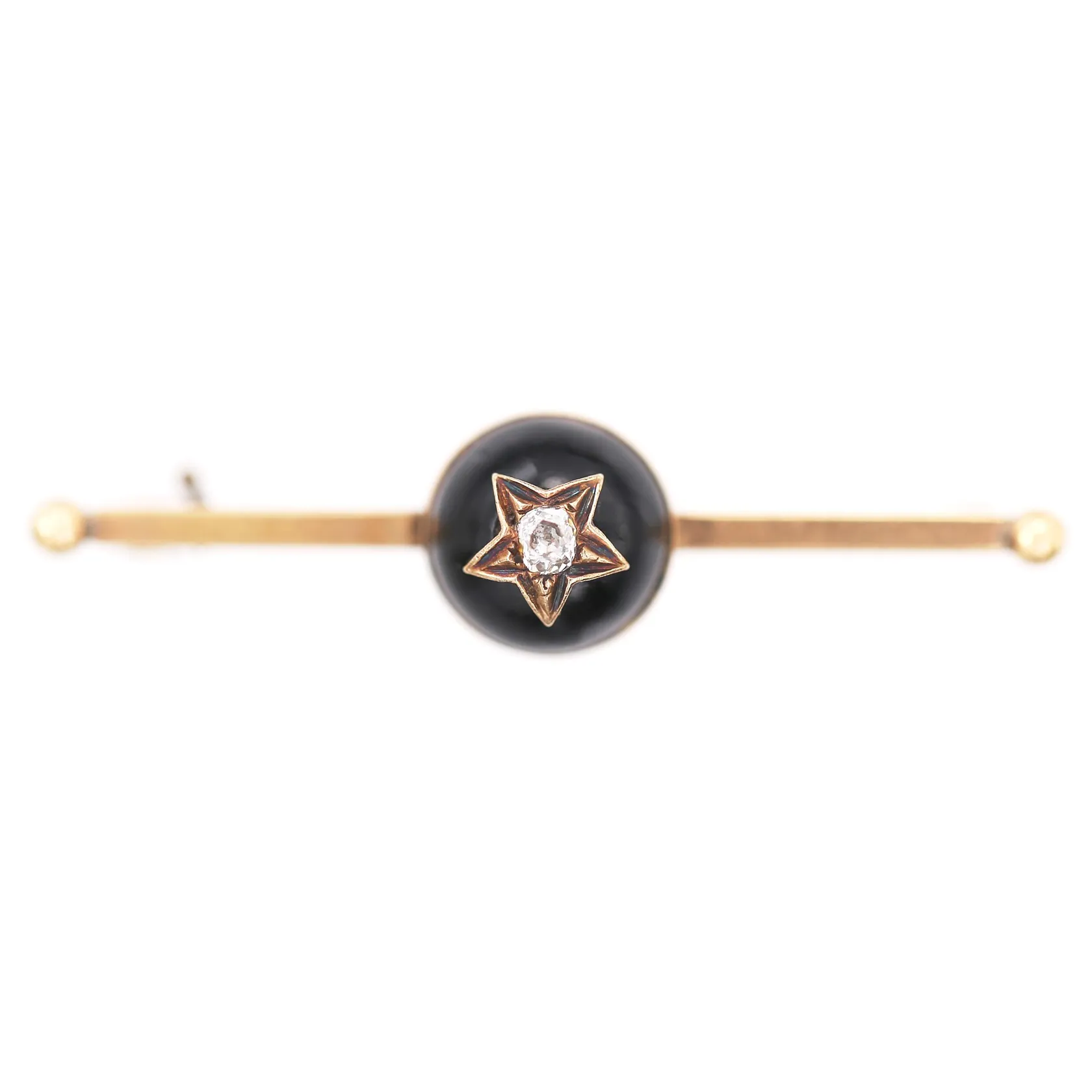 Brosch med svart bandagat samt gammalslipad diamant ca 0,10ct, längd 42mm, troligen engelsk, ca år 1860 -1880, sorgesmycke, 14K guld. Vikt: 3,2 g.