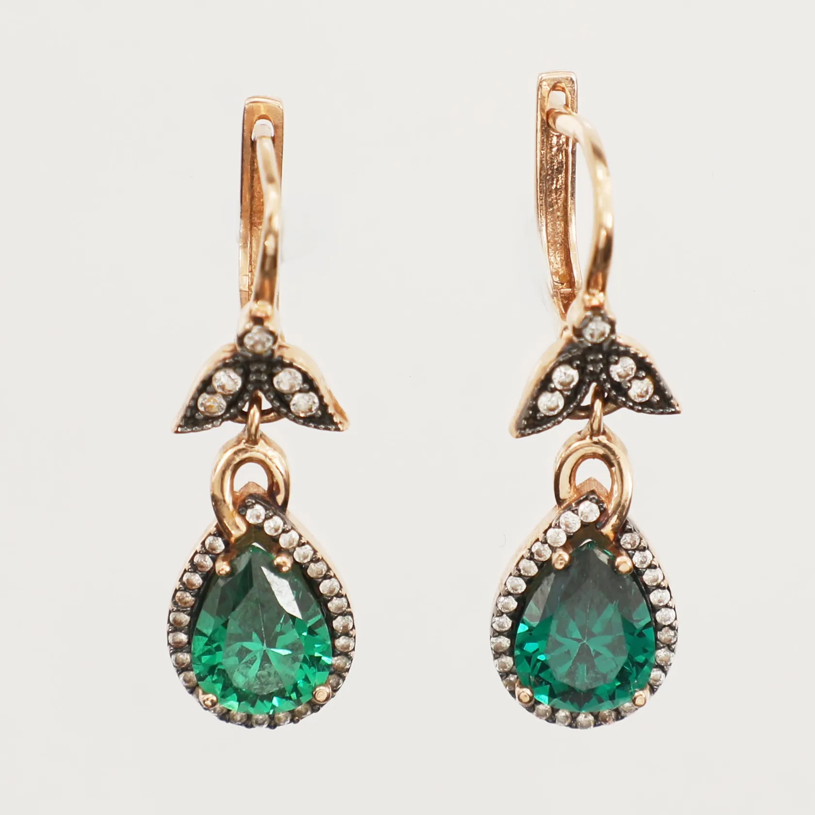 Ett par örhängen med gröna och vita stenar, längd 27mm, bredd 9,5mm, 14K Vikt: 5,6 g.