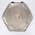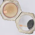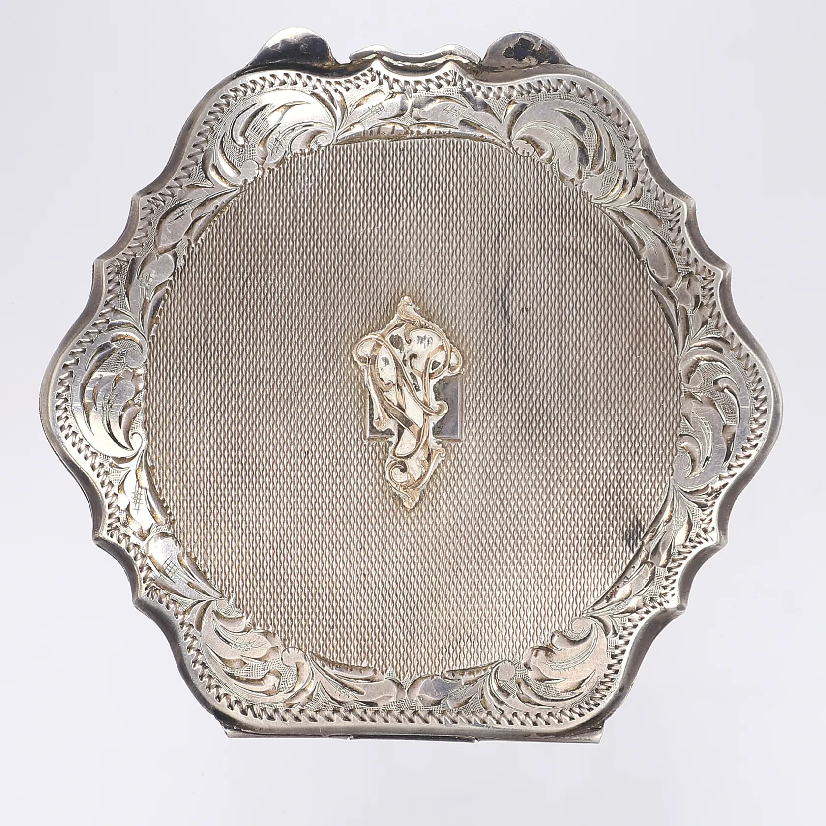 Puderdosa 1900-talets första hälft ca 85x85mm invändigt med spegelskiva ovansidan med monogram av sannolikt 14K guld silver 900/1000 vikt 124,8g brutto Vikt: 124,8 g.