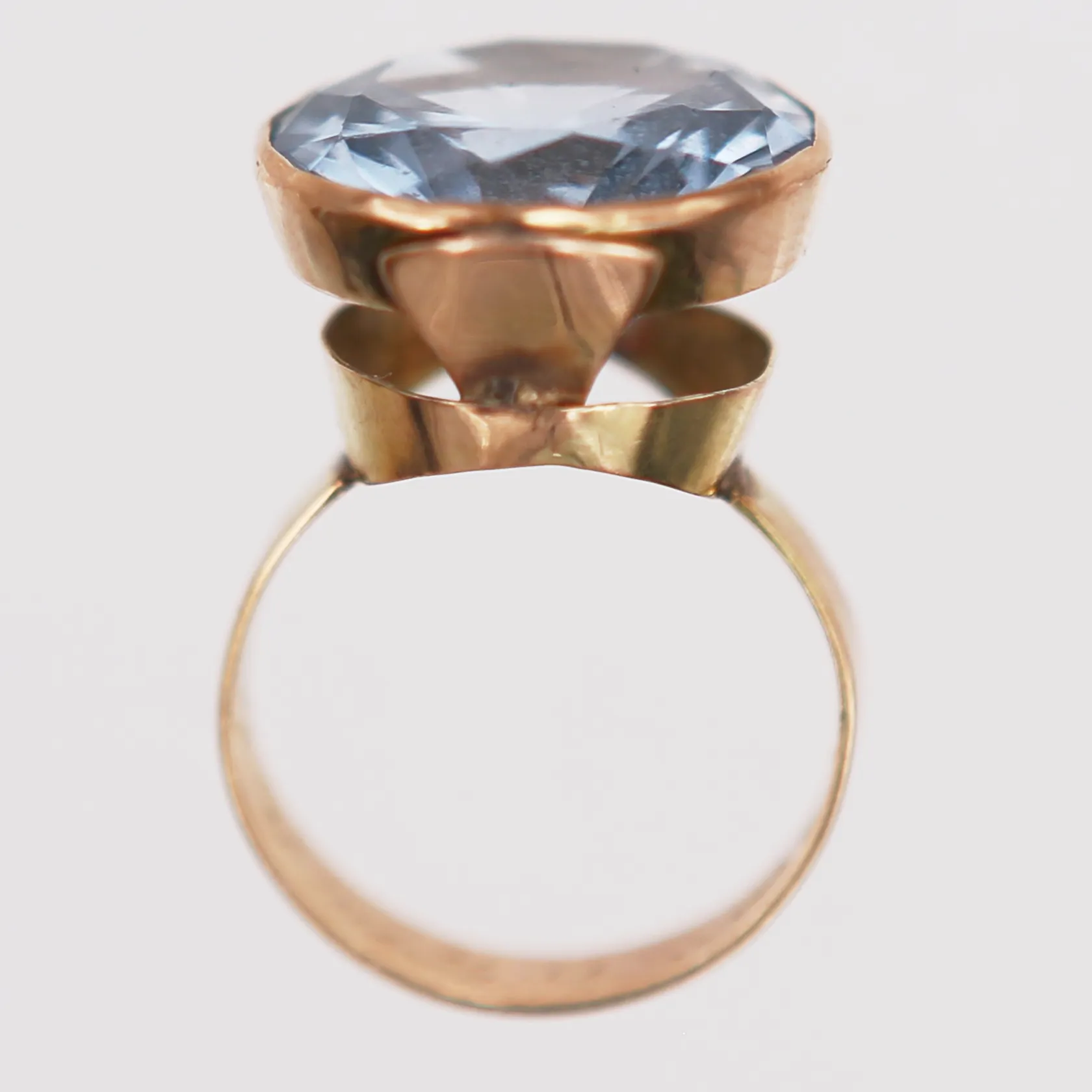 Ring med syntetisk spinell, stl 16¼, bredd 5-17mm, finska stämplar, ojämnheter, sten med flertalet mindre nagg, 14K guld. Vikt: 5,4 g.