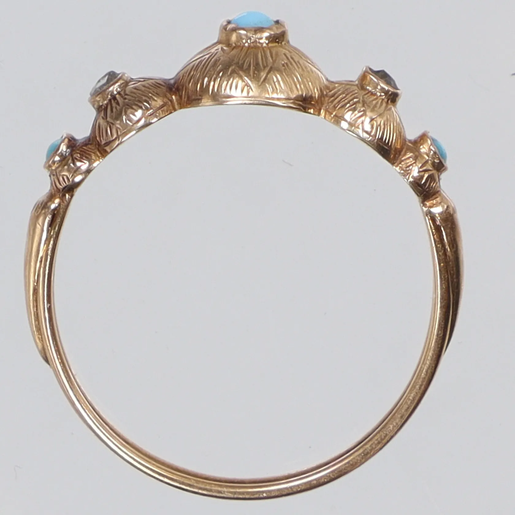 Ring med turkoser samt rosenslipade diamanter 2xca0,015ct stl16¾, bredd 2-6mm GD&Co (G. Dahlgren & Co) Malmö årstämplad troligen M7 = 1914, 18K Vikt: 1,3 g.