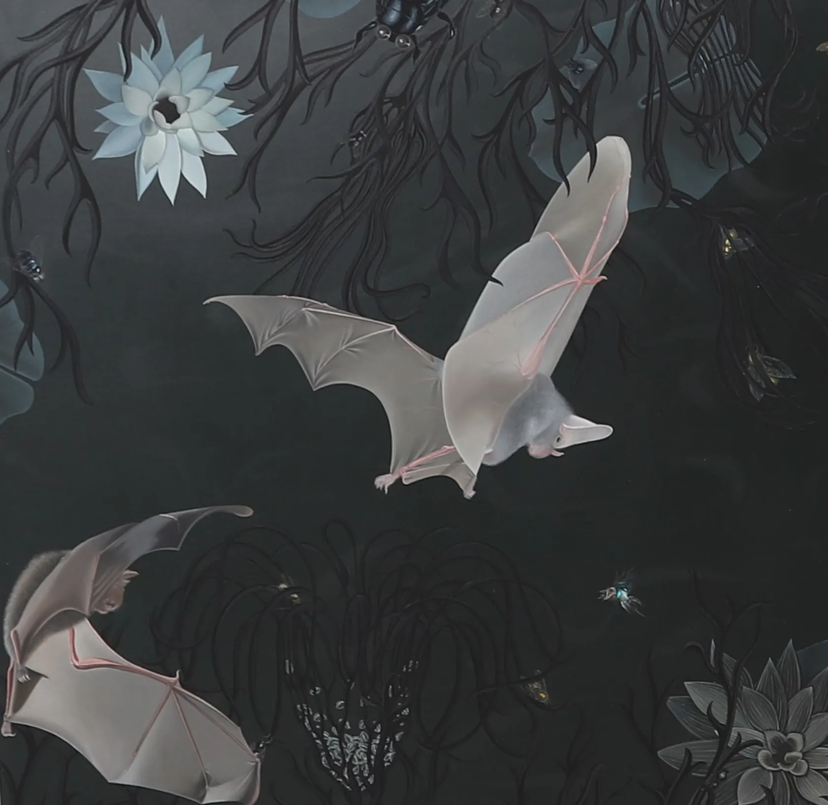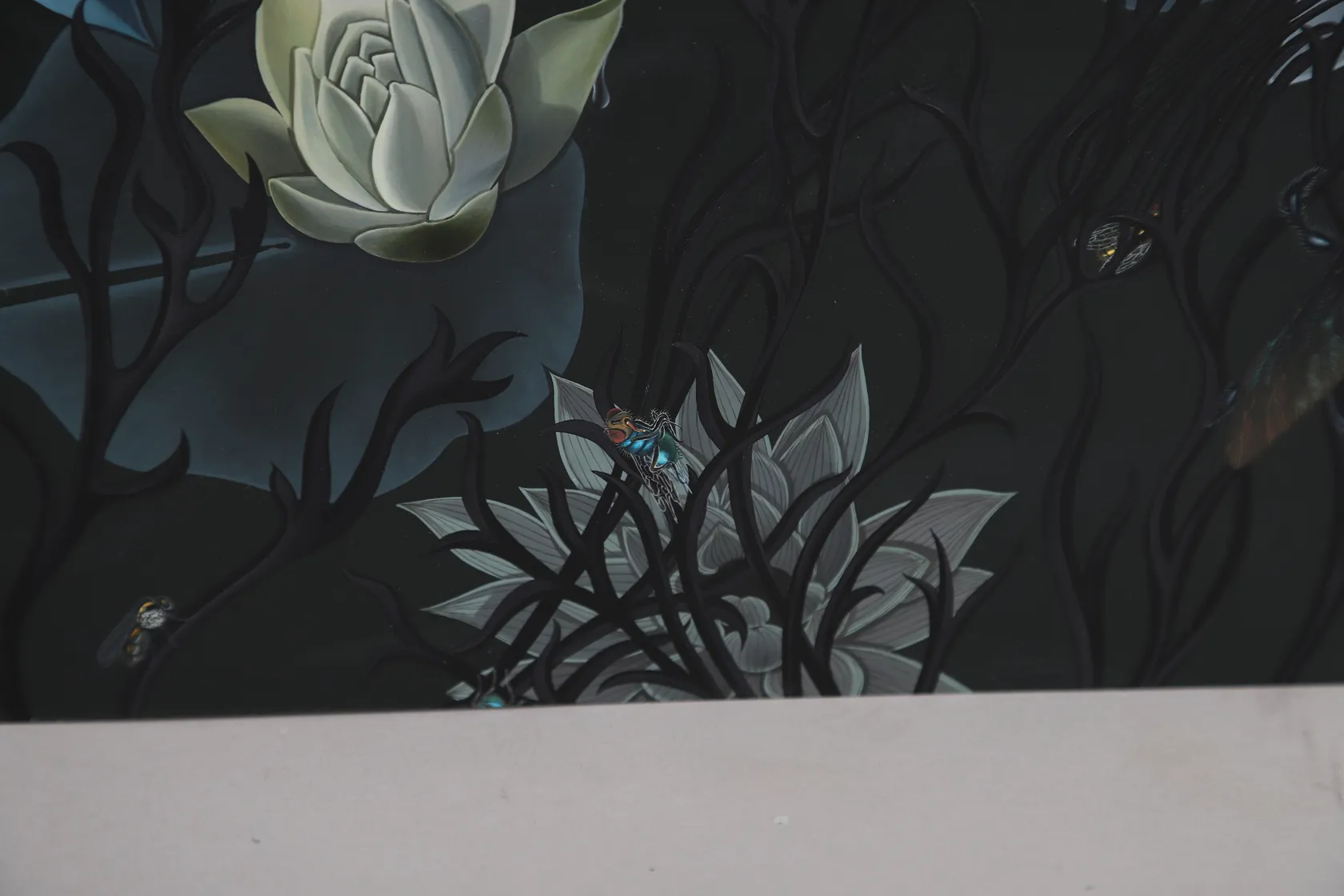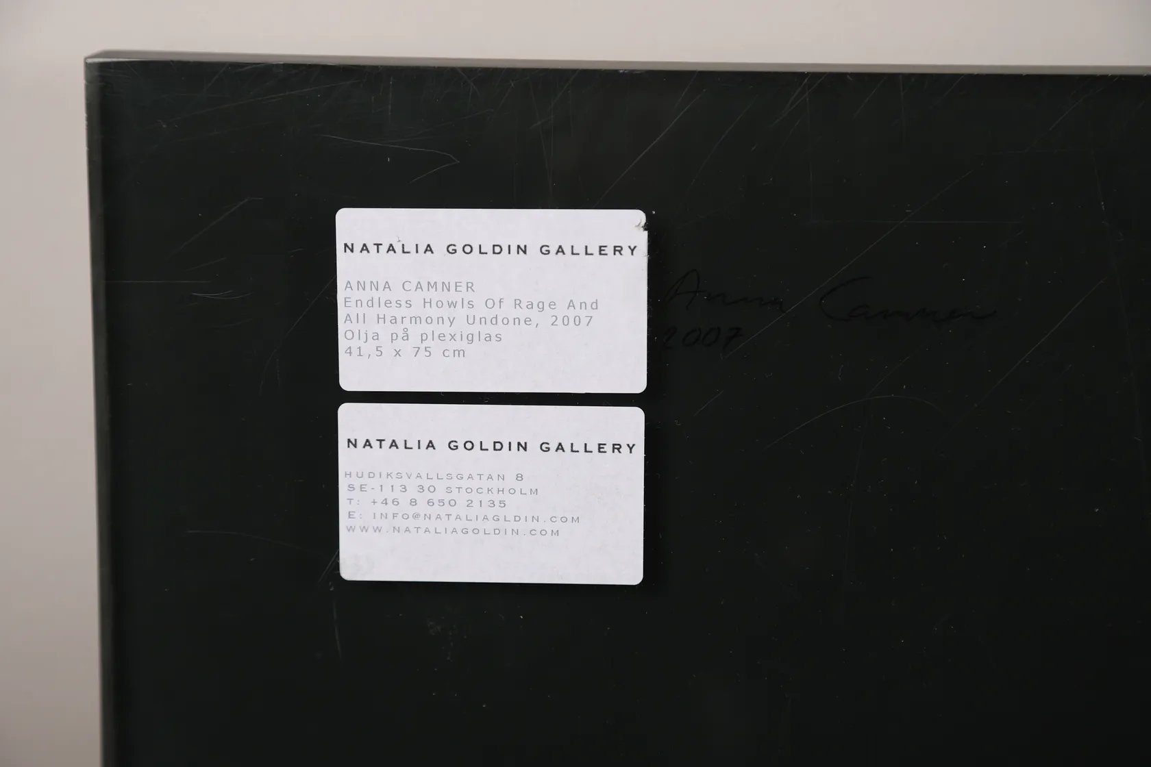Tavla, olja på plexiglas, Anna Camner, "Endless Howls of Rage And All Harmony Undone ", a tergo signerad, samt etikett Natalia Goldin Gallery, 2007, Hudiksvallsgatan, Stockholm. Vid baksida repor, mindre sprickor. Skickas med postpaket. Omfattas av BUS-avgift.