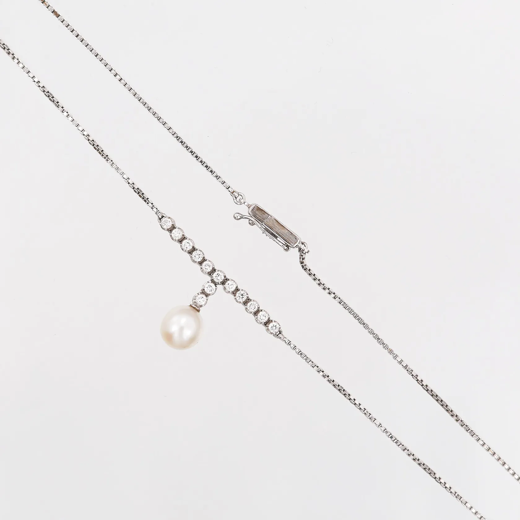 Collier med odlad saltvattenpärla, Ø 9mm, samt briljantslipade diamanter 13 x ca 0,035ct, totalt ca 0,45ct, längd på kedja 40cm, höjd på hänge18mm, 18K vitguld Vikt: 7,6 g.