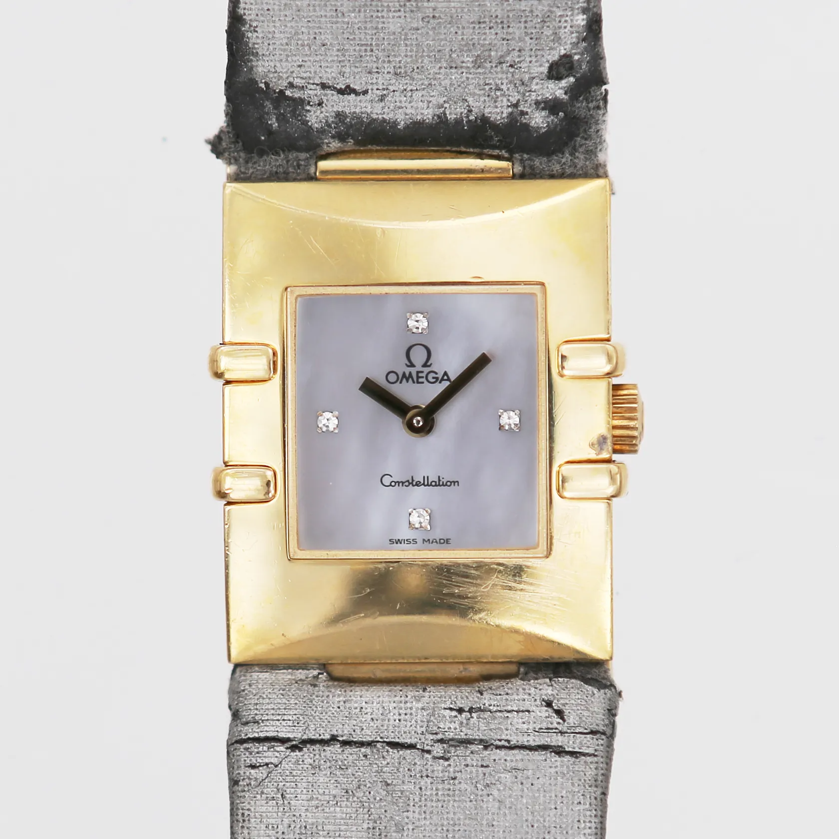 Damur Omega Constellation, boett samt spänne i 18K, quartz, pärlemorurtavla, boettnummer 57484415, läderband defekt, bruttovikt 31,5g.