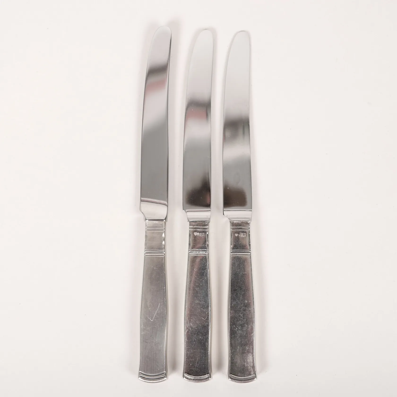 Tre Bordsknivar, modell Rosenholm, GAB, Eskilstuna och Stockholm, 1900-talets andra hälft, längd ca 20cm, stålblad och silver, bruksslitage, silver, bruttovikt 192,6g Vikt: 192,6 g.