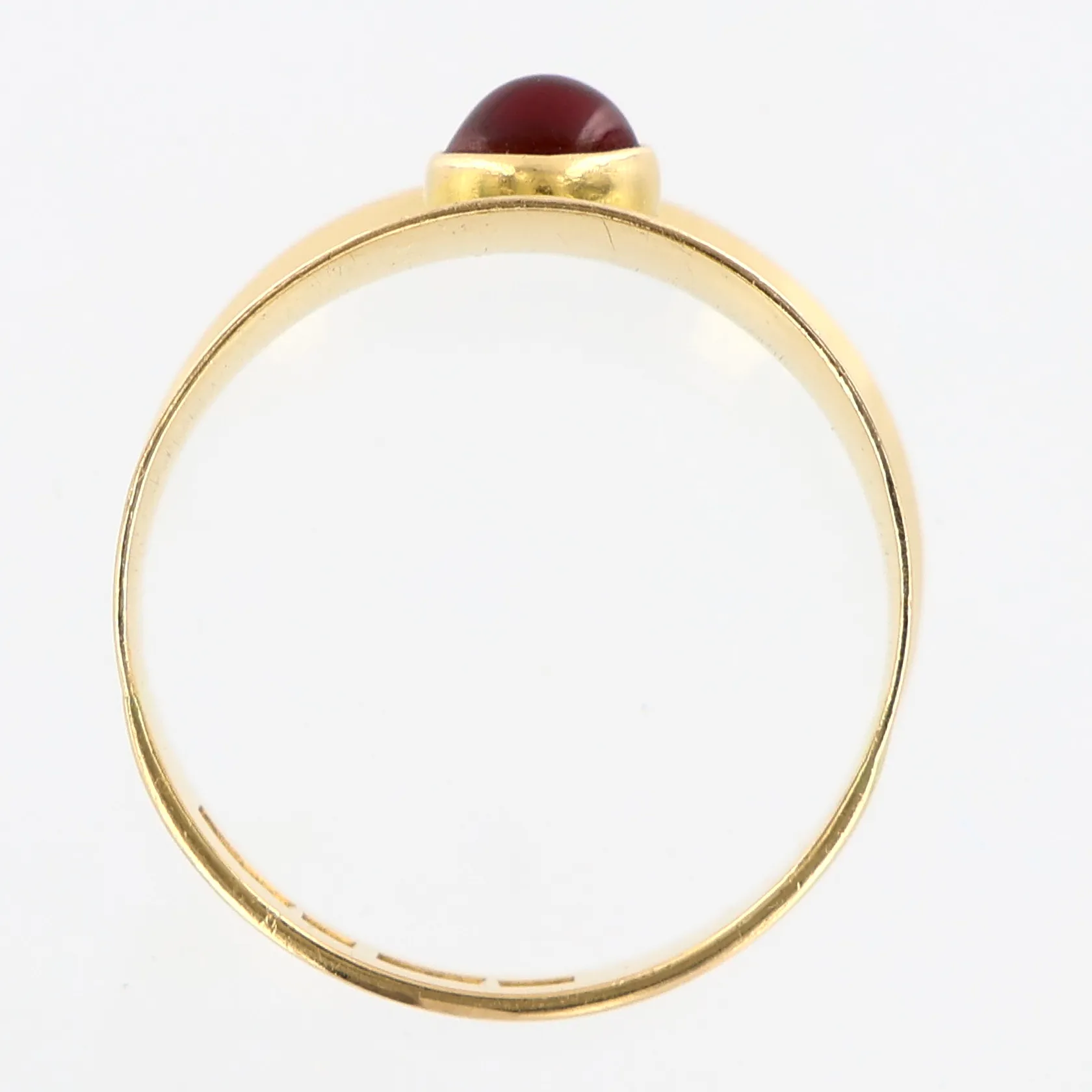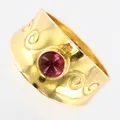 Ring med röd sten, stl 17, bredd ca 6mm, 18K Vikt: 3,4 g.