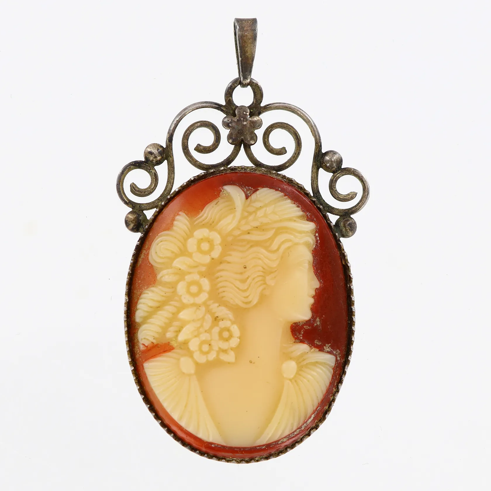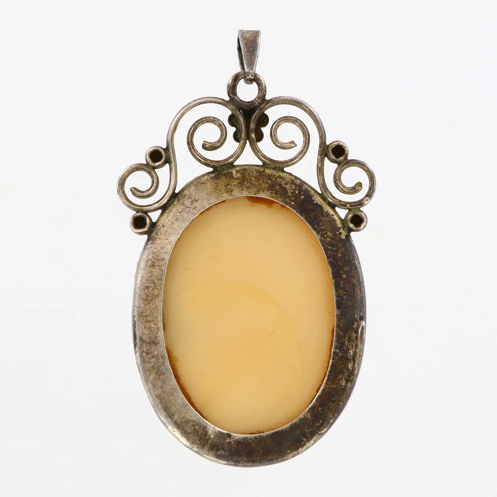 Hänge med plastcamé, ca 50mm, camé något lös, 835/1000 Silver Vikt: 10,3 g.