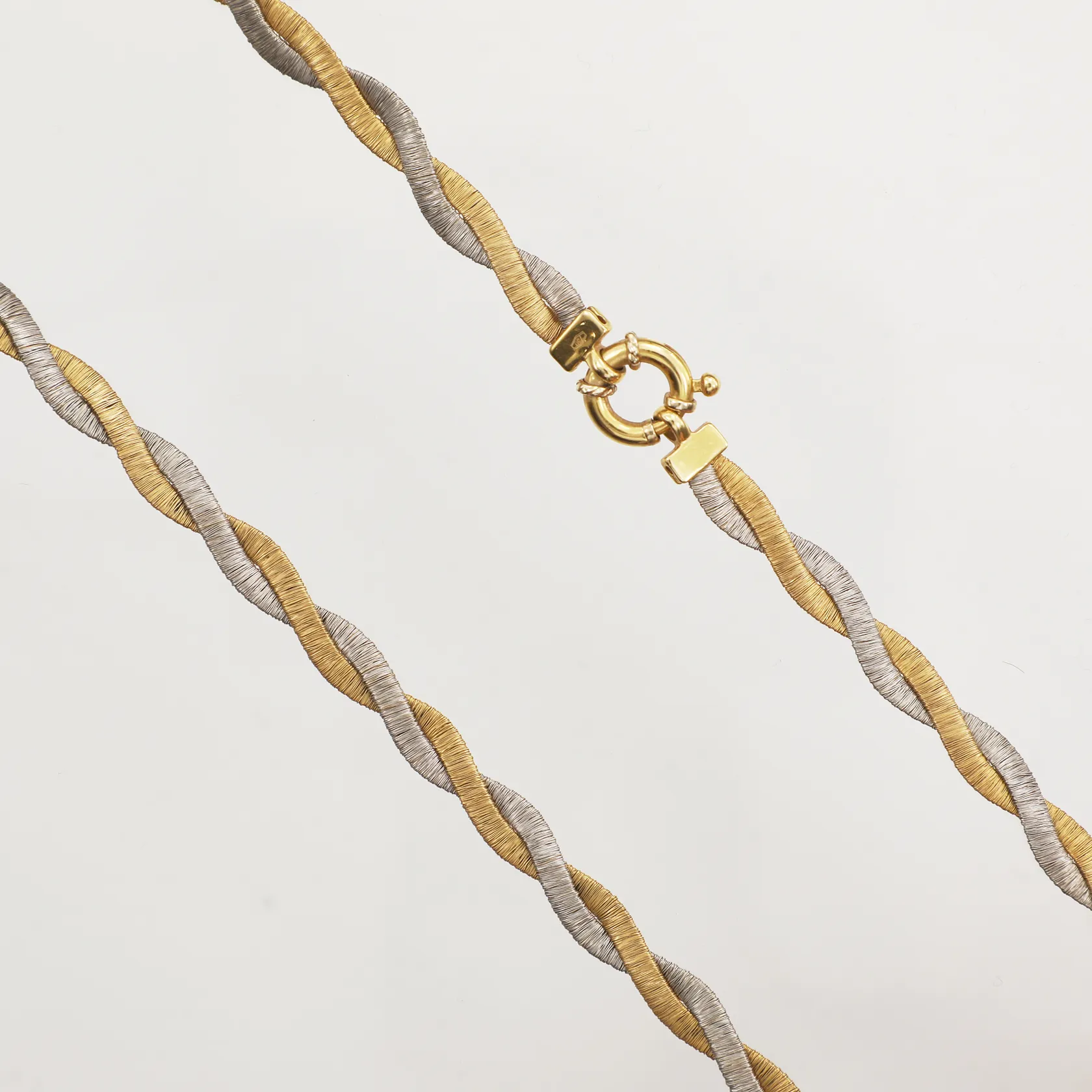 Collier, tretonat med matterad yta, ca 41cm, bredd ca 5,8mm, vridet vid låset, Guldfynd, 18K Vikt: 19,8 g.