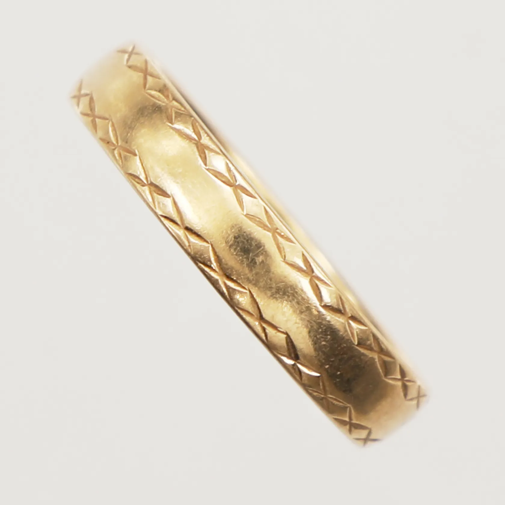 Ring med mönsterdekor, stl 18¾, bredd 3,9mm, 18K Vikt: 3,5 g.