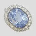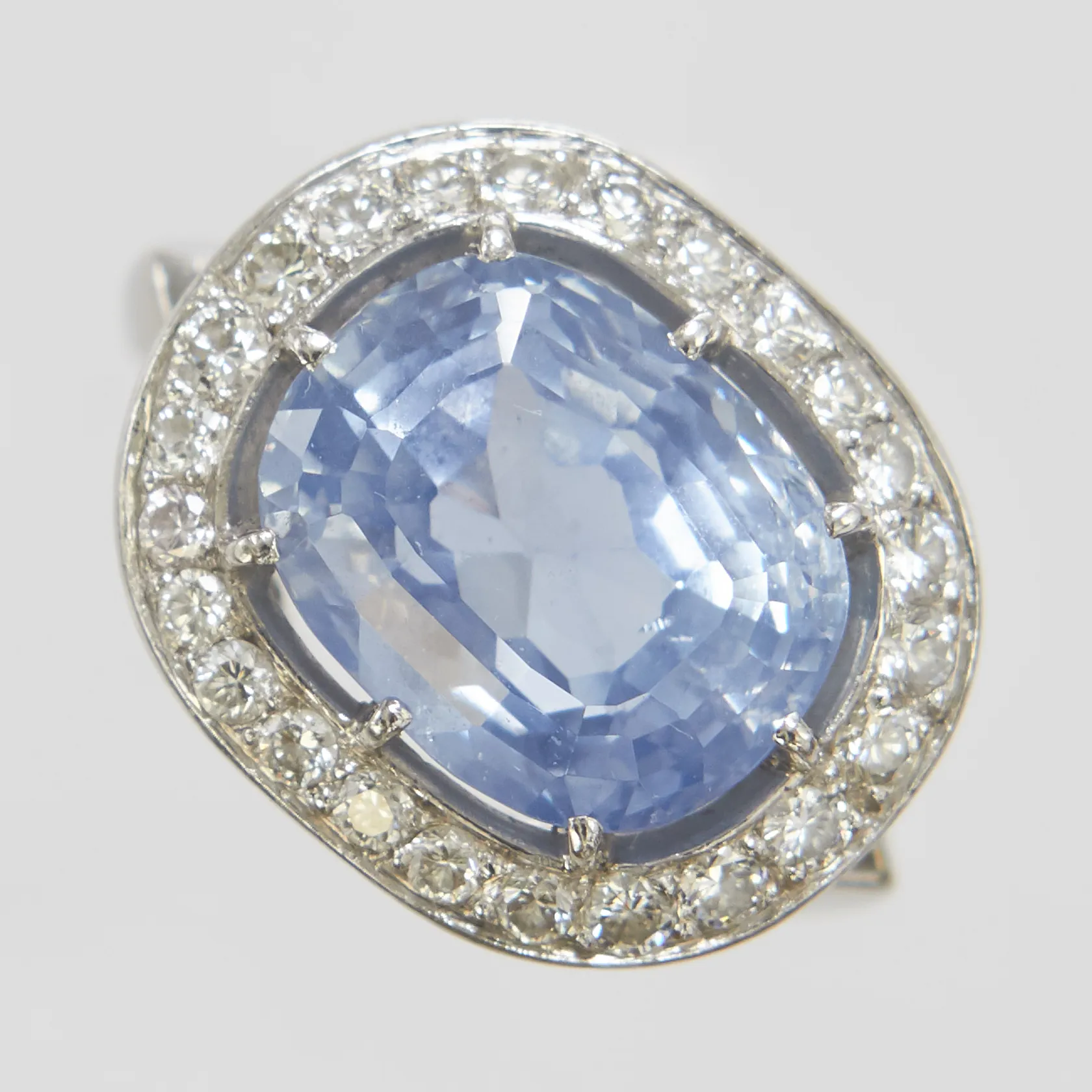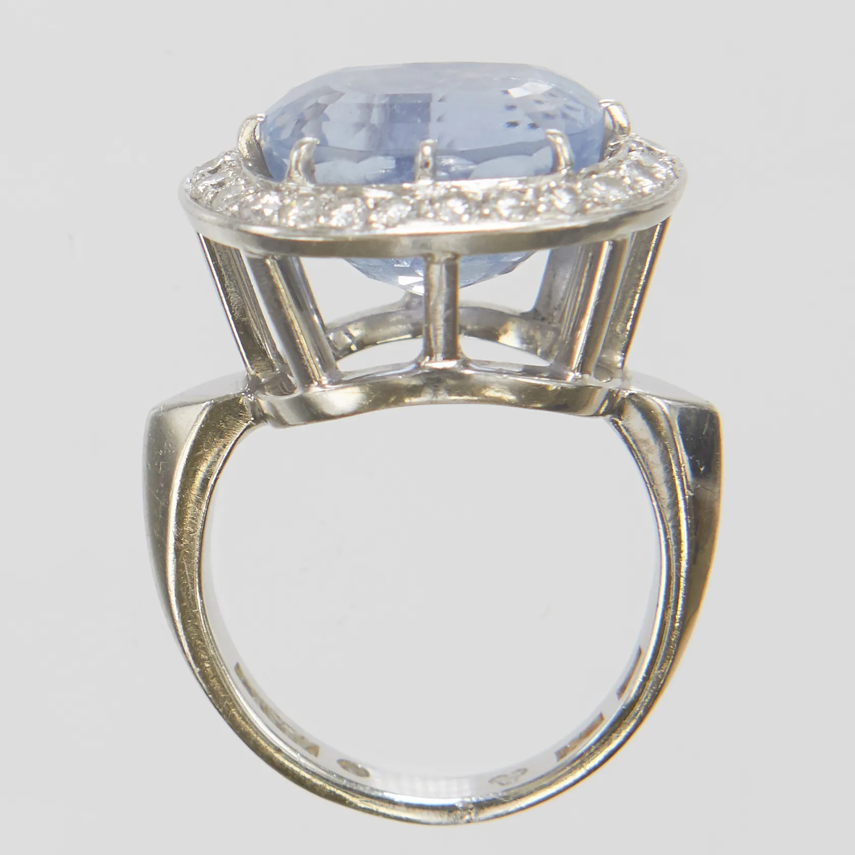 Ring med obehandlad ljusblå safir ca 8,00ct, diamanter 24 x ca 0,02ct, tillverkad av Lantz, Stockholm år 1972, stl: 16, 18K vitguld. finns för visning på kontoret Östermalm Vikt: 9,5 g.