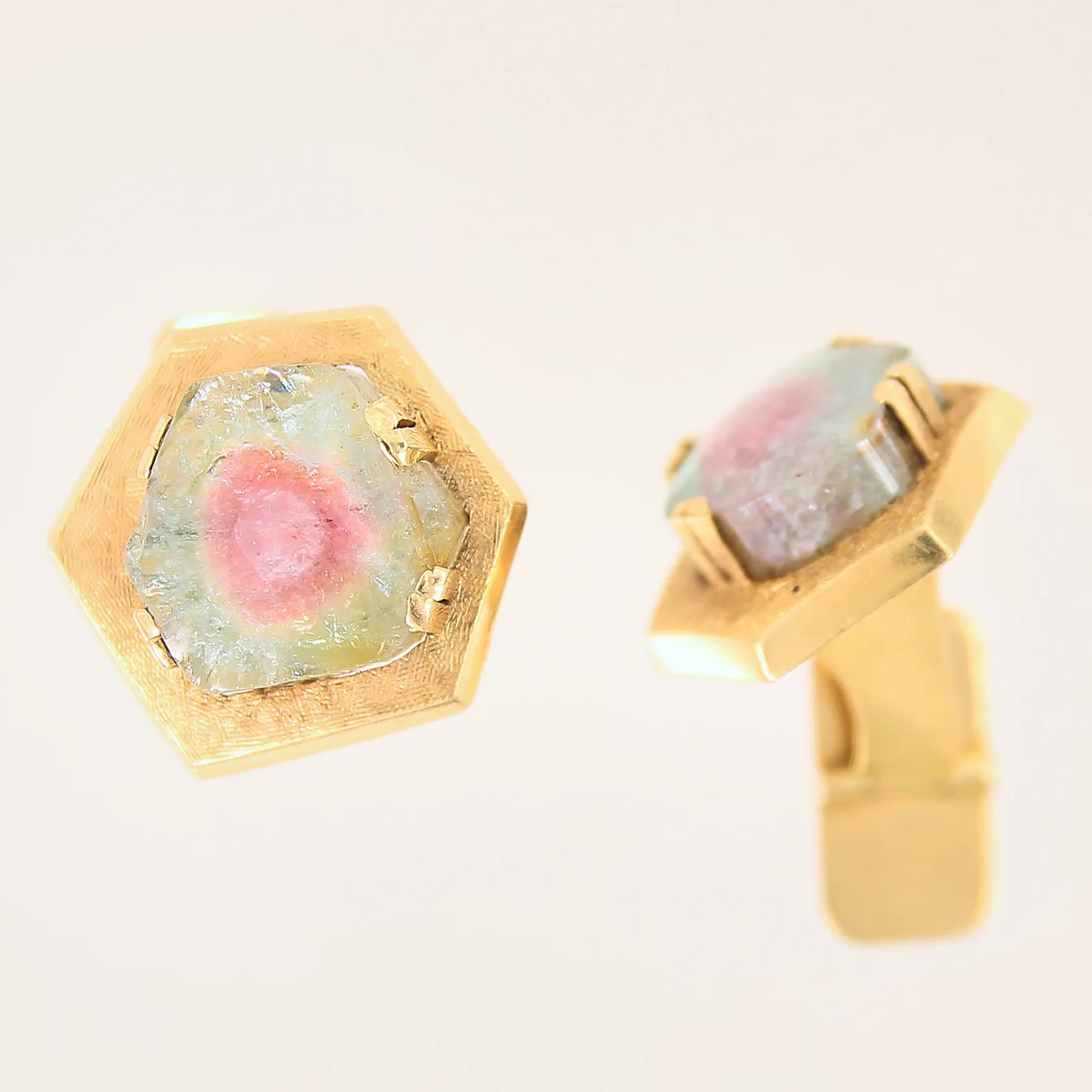 Ett par manschettknappar med vattenmelonturmaliner, 2 x ca 9.00ct, Ø19mm, Guldvaruhuset i Hallberg, år 1970, 18K guld, bruttovikt: 20,9g Vikt: 20,9 g.