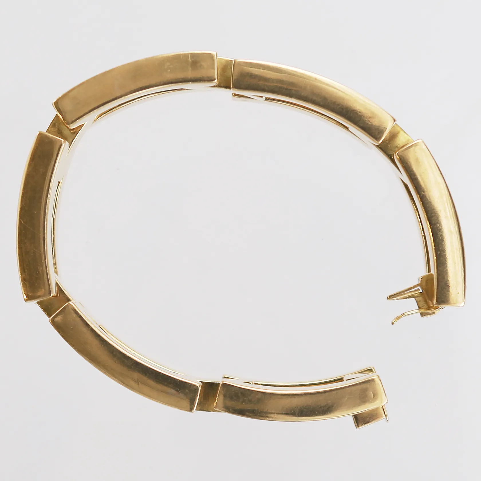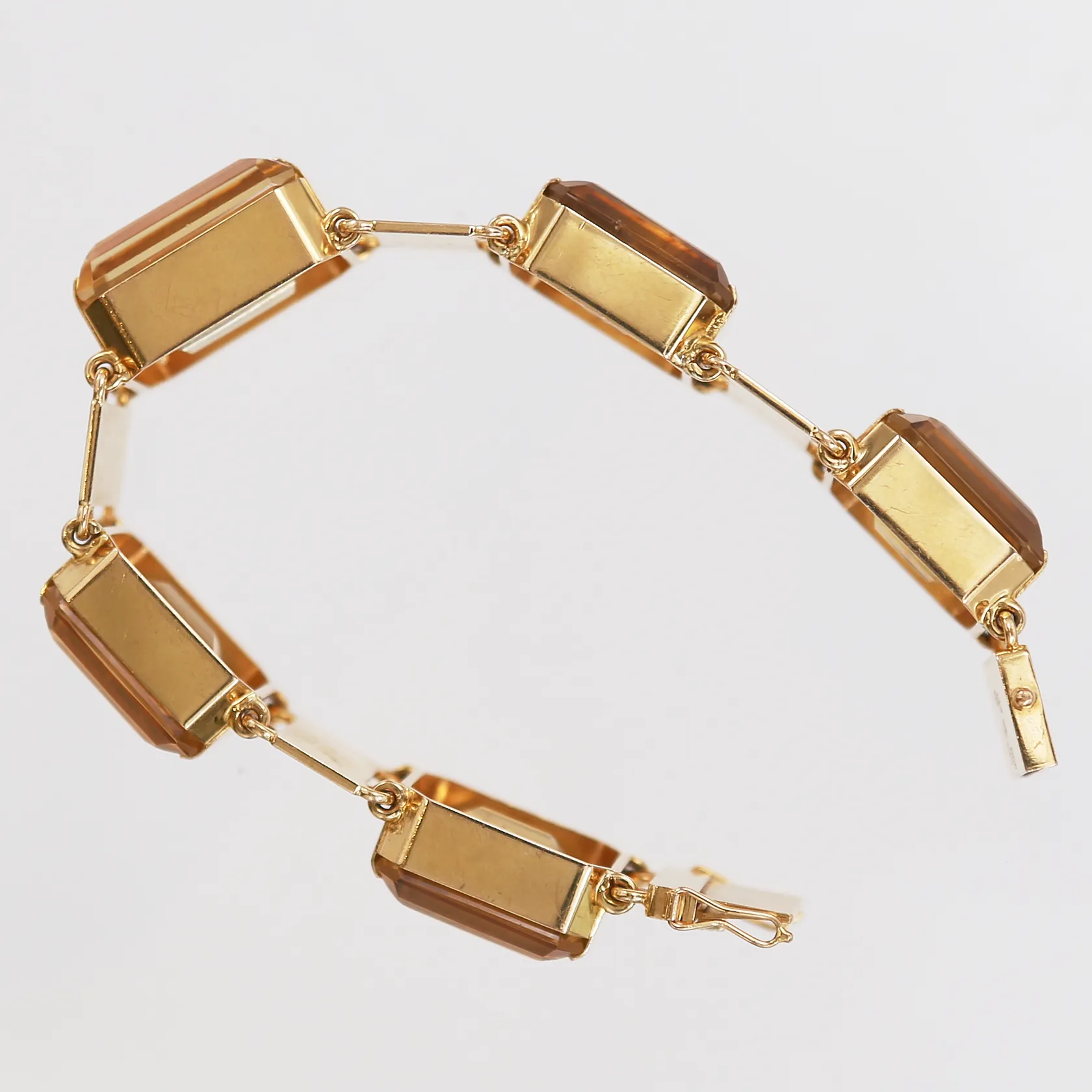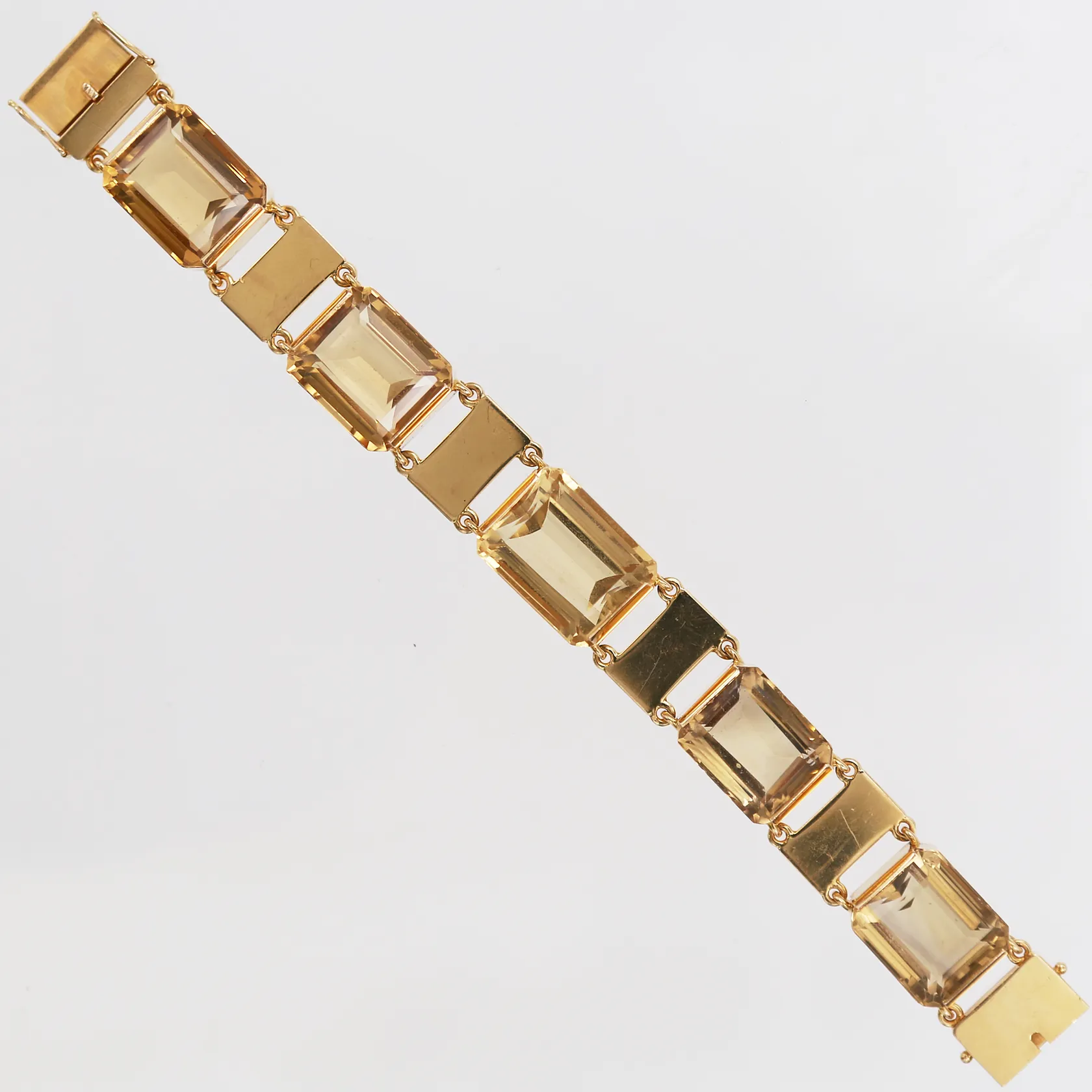 Armband med 5st smaragdslipade citriner, totalt ca 75,00ct, längd 16cm, bredd 15mm, tillverkad av Smyckeboden Olle Torrestad, Halmstad, år 1966, 18K guld, Vikt: 46,9 g.
