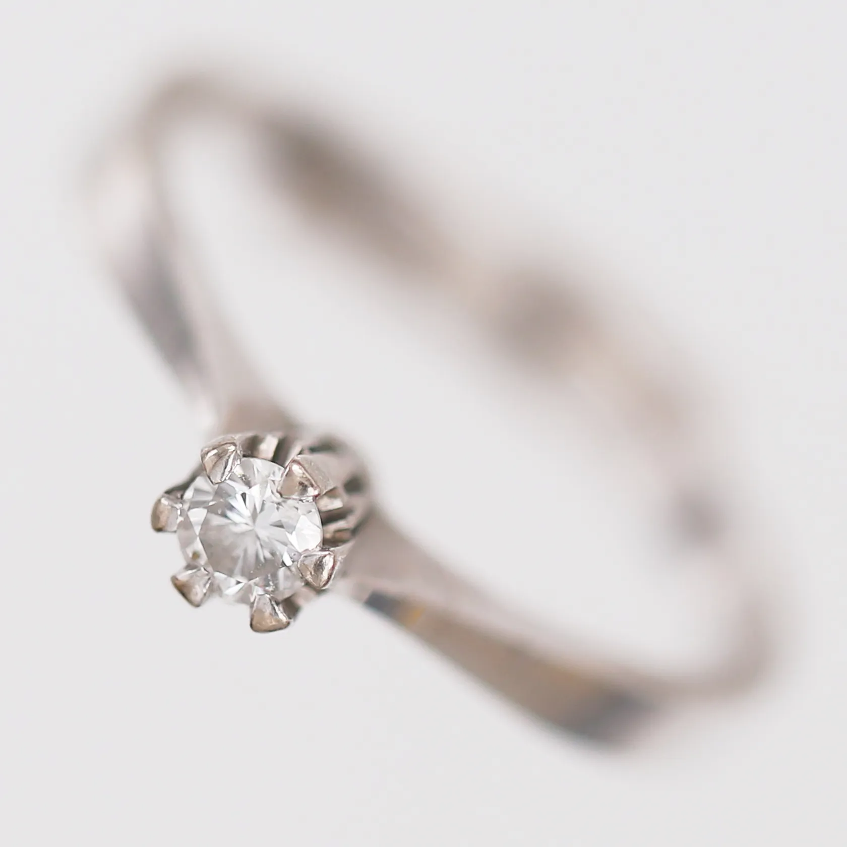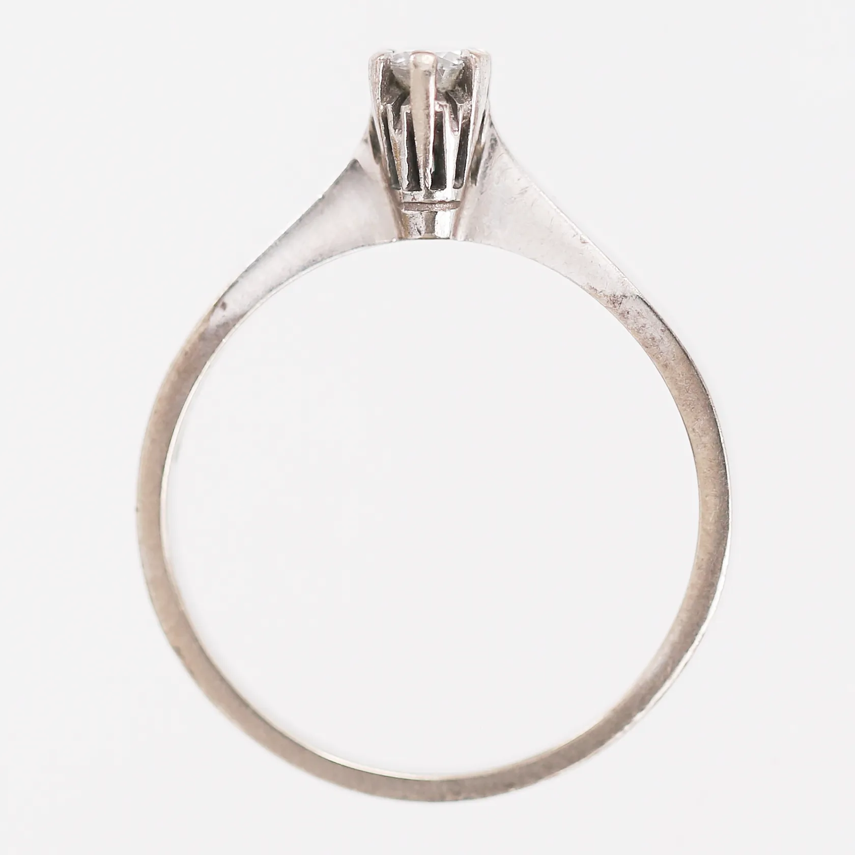 Ring med diamant 1 x 0,12ct enligt gravyr, stl: 17¼, bredd: 2-4mm, år 1975, 18K vitguld. Vikt: 2,7 g.