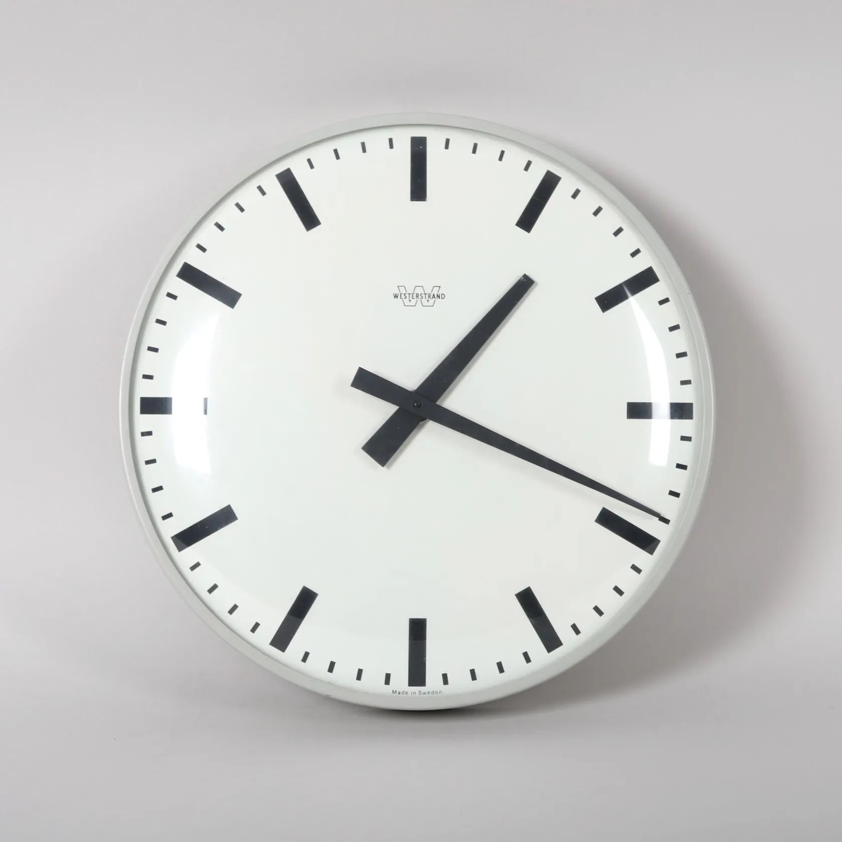 Väggur Westerstrand, vit urtavla med stavindex, ca Ø31cm, 1900-talets andra hälft, står still, ej funktionstestad, slitage.