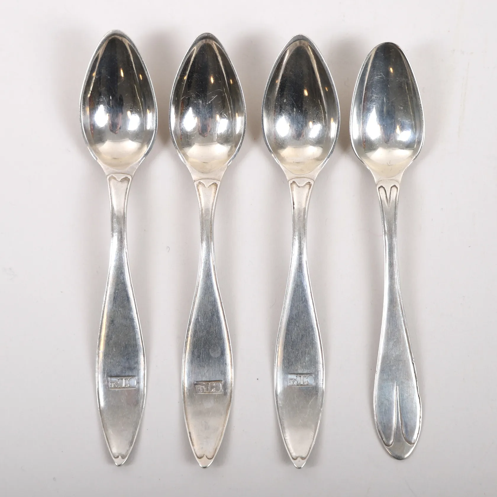 Fyra skedar, 1800-tal, tre med otydliga stämplar, längd 14-14,5cm, slitage, monogram/gravyr, silver. Vikt: 91,4 g.