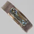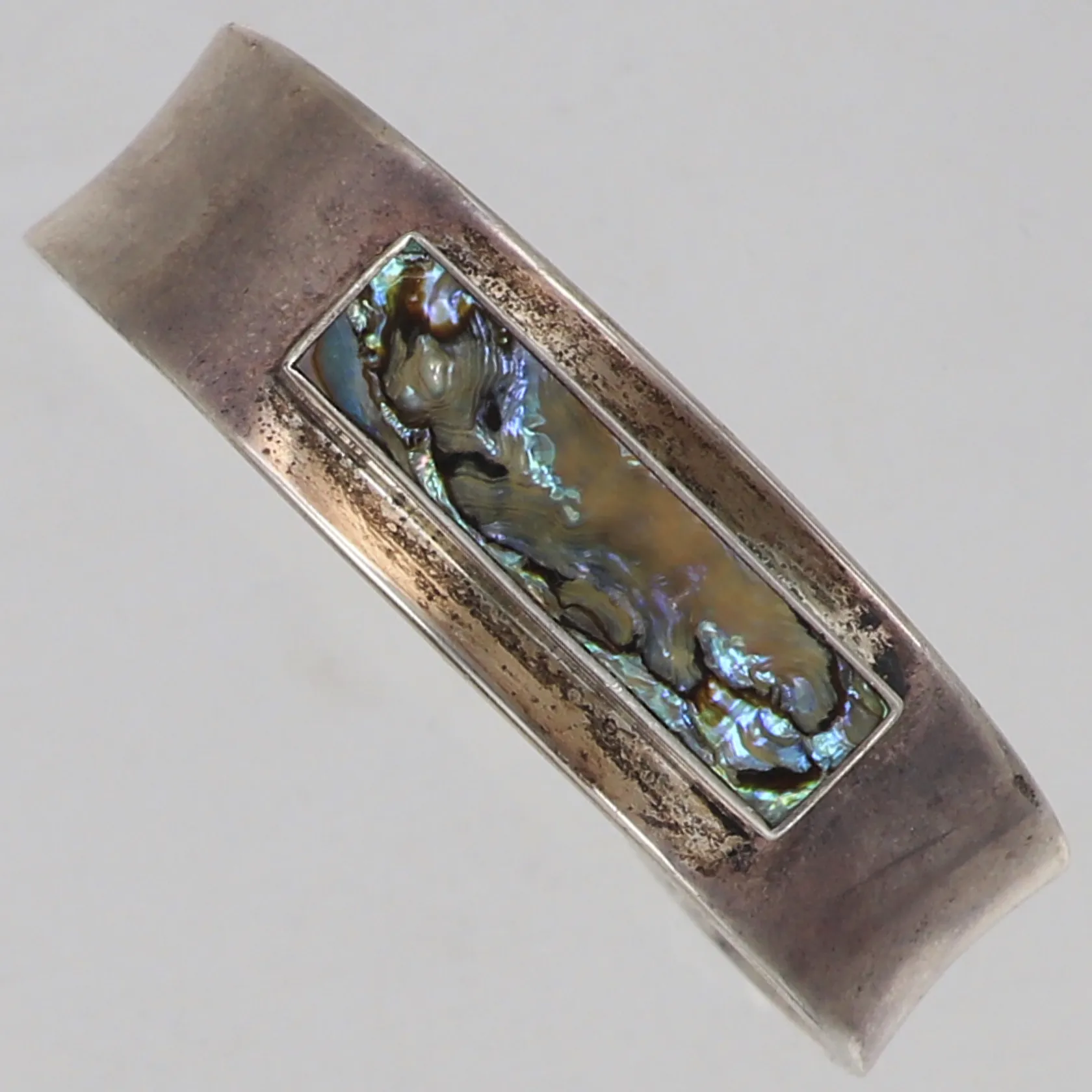 Stelt armband med pärlemor, innermått ca 17cm, bredd 12,5-17mm, stämplad AJ Denmark, 925/1000 silver Vikt: 34,7 g.