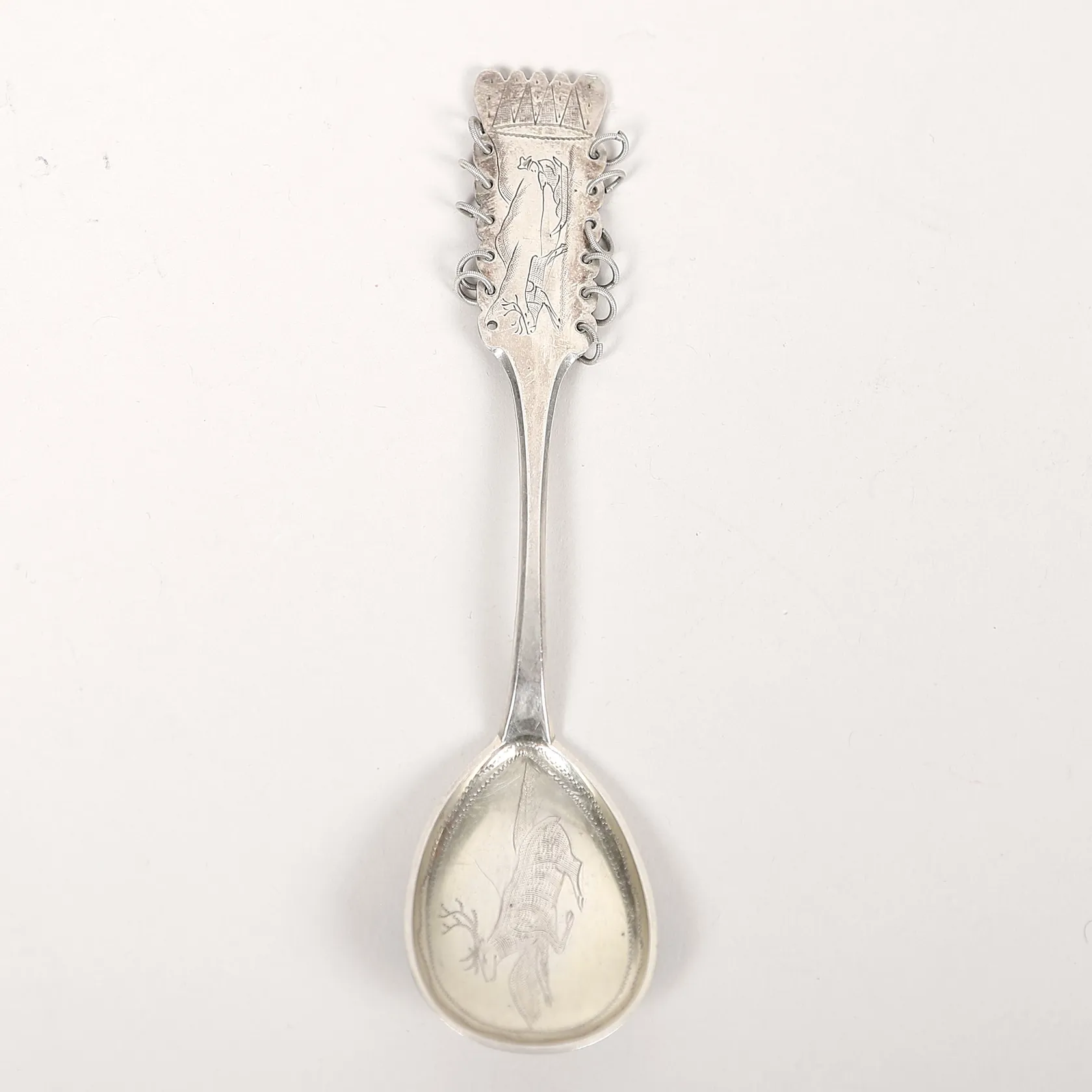Sked, samemodell, graverad dekor av same och ren, längd: 15,2cm, gravyr, slitage, silver. Vikt: 21,2 g.