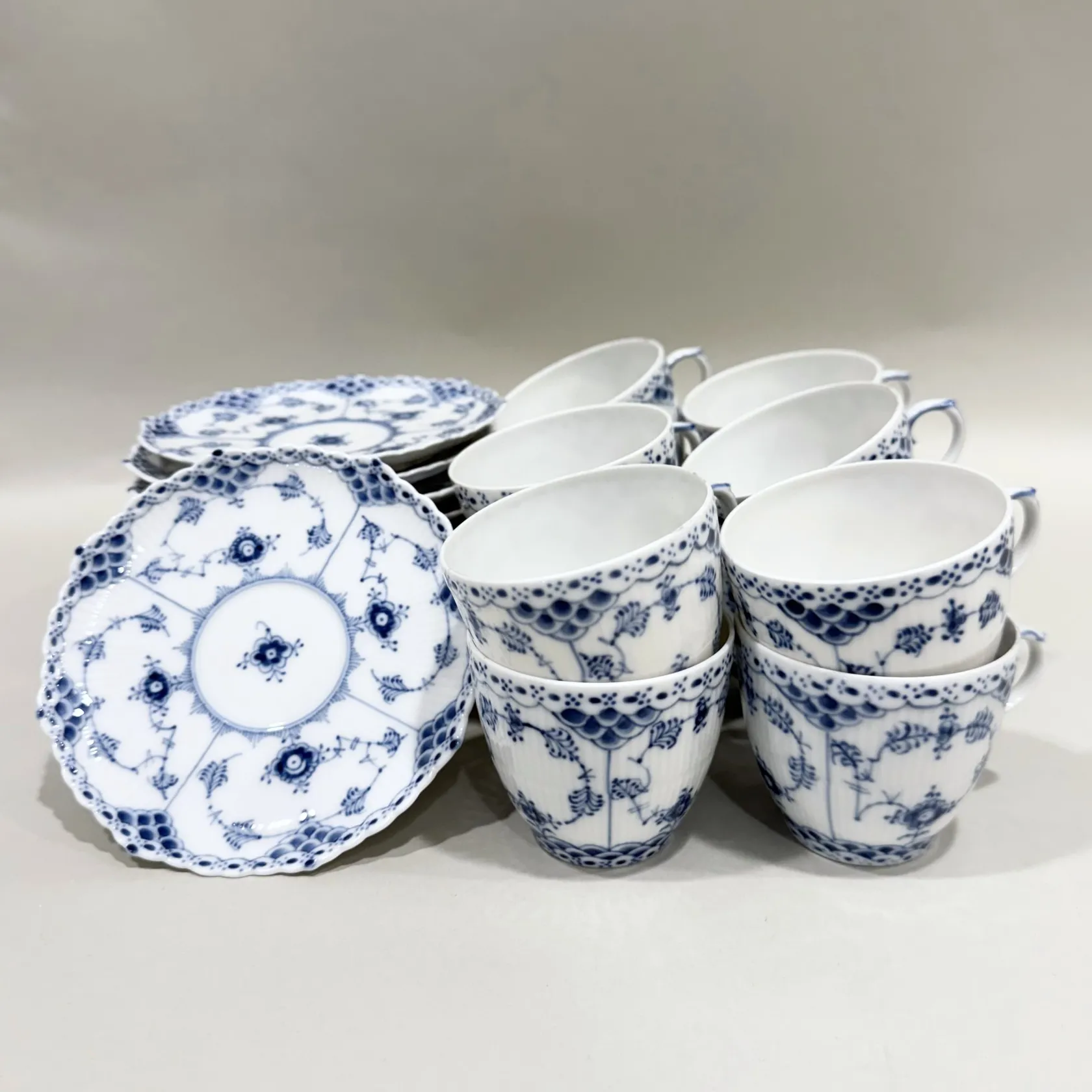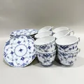 12st Kaffekoppar med fat, Musselmalet, halvblond, Royal Copenhagen, numrerade: 1/1035, en av kopparna med genomgående spricka Skickas med postpaket.