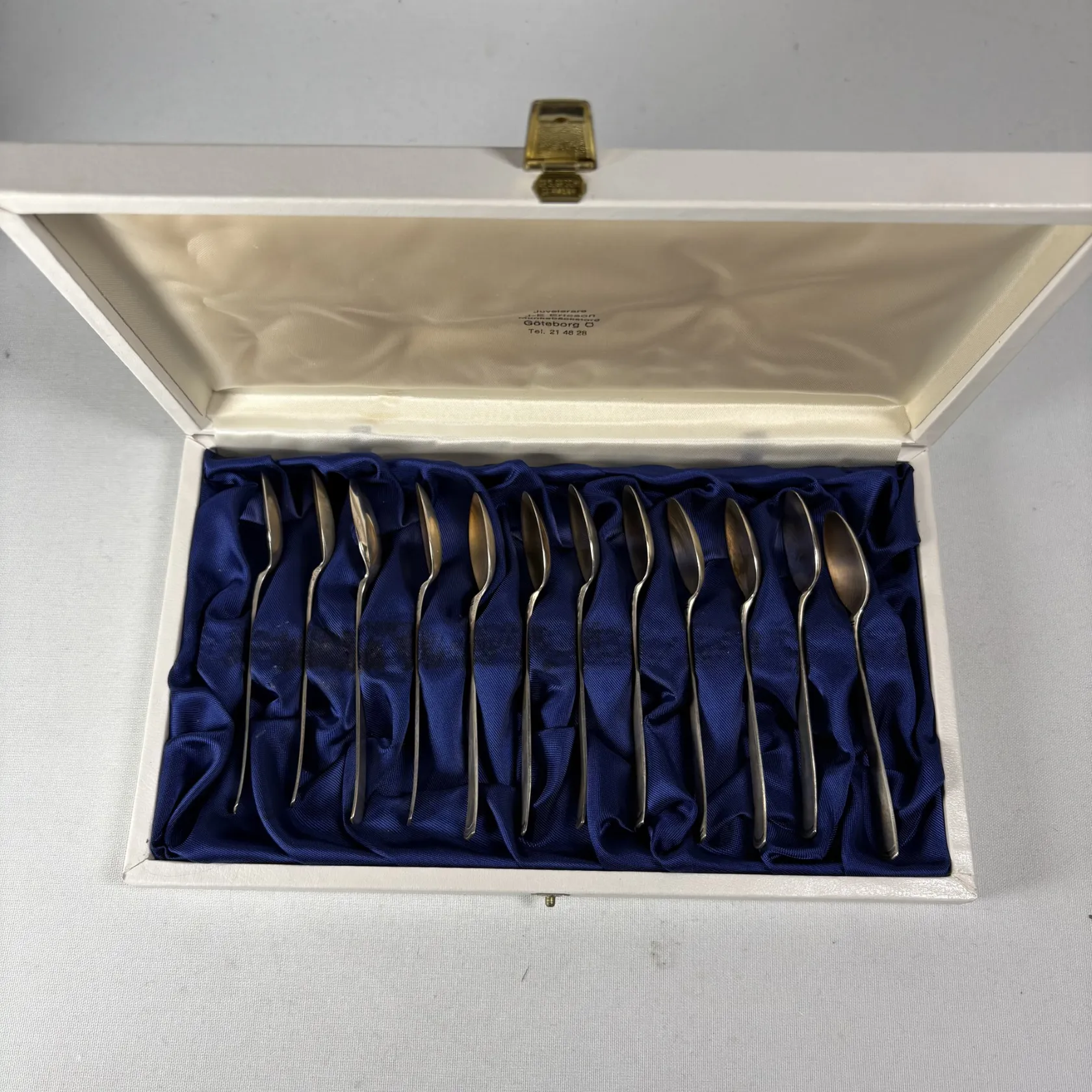 12 Kaffeskedar Rosenholm formgivna av Jacob Ängman (1876-1942) för GAB år 1934 dessa exemplar 1960-90-tal längd 11cm silver 830/1000 Vikt: 141,3 g.