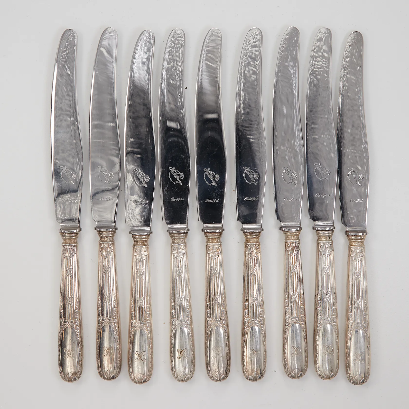 9 Knivar, modell Louis XVI, ca 188mm, monogramgravyr, blad i stål, CGH, Silver 830/1000 bruttovikt 303,8g Vikt: 303,8 g.