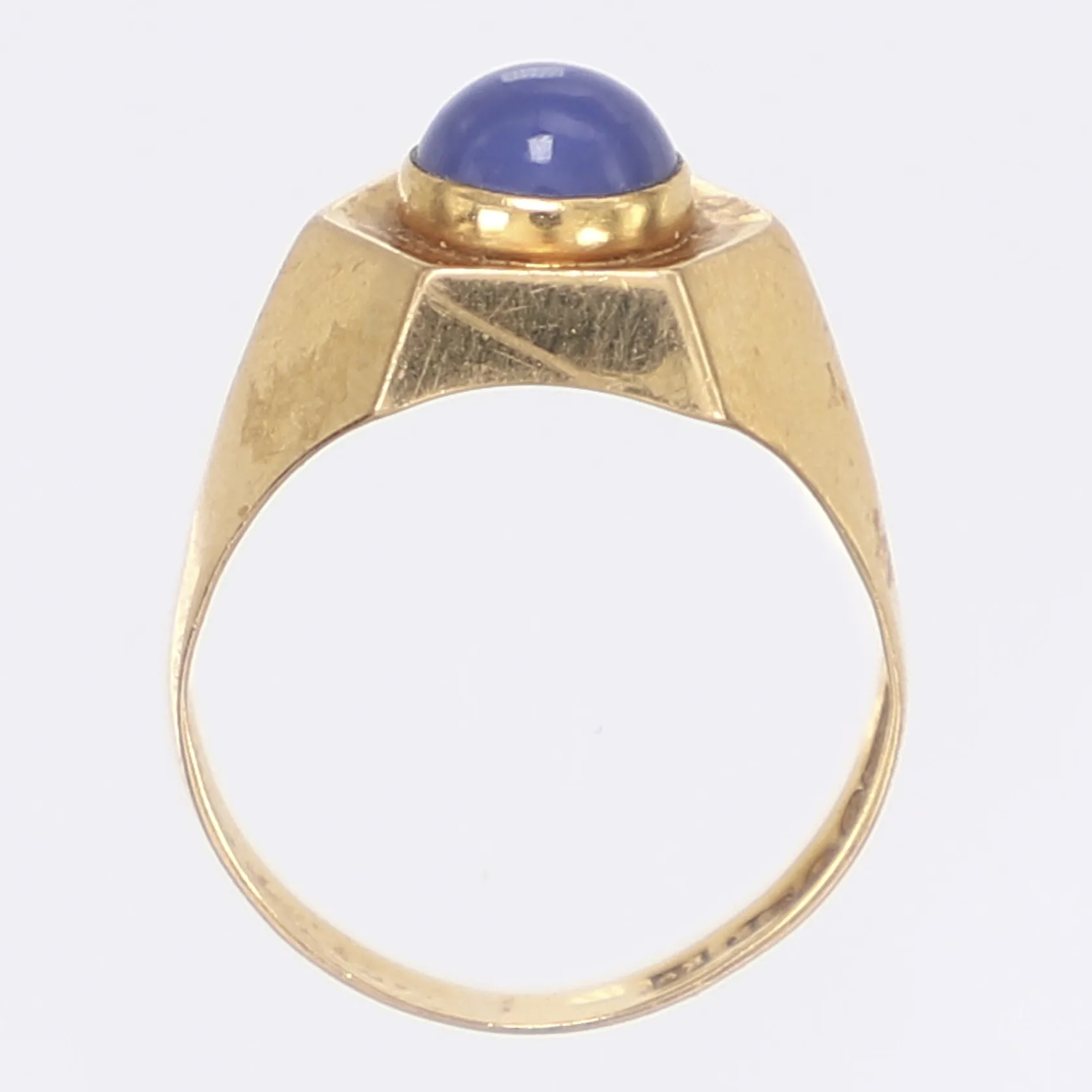 Ring med opak lila sten, stl 17½, bredd 3-12mm, svenska stämplar, 18K bruttovikt: 3,3g Vikt: 3,3 g.