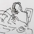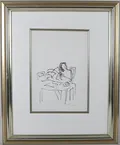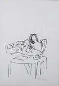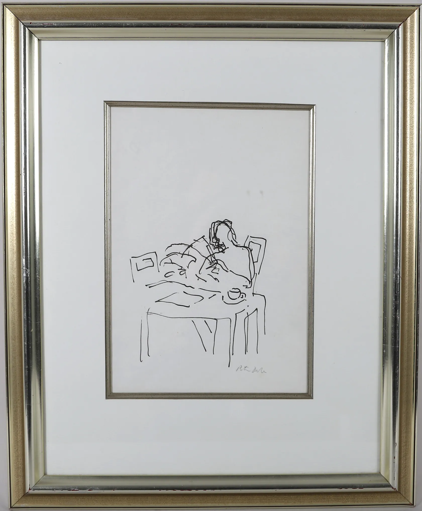 Tavla, Peter Dahl, tusch på papper, signerad med blyerts, man vid frukostbord med tidning, dagmått ca 30x21cm, ram med slitage, ej examinerad. Skickas med postpaket. Omfattas av BUS-avgift.