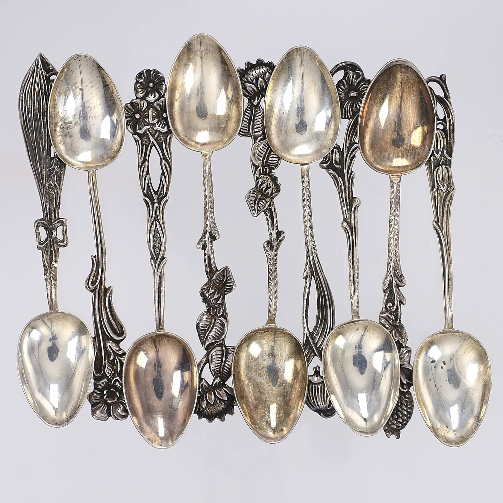 9 Kaffeskedar/mockaskedar Svenska Floran GEWE Malmö 1970-tal längd 10,2cm silver 830/1000 Vikt: 81,2 g.