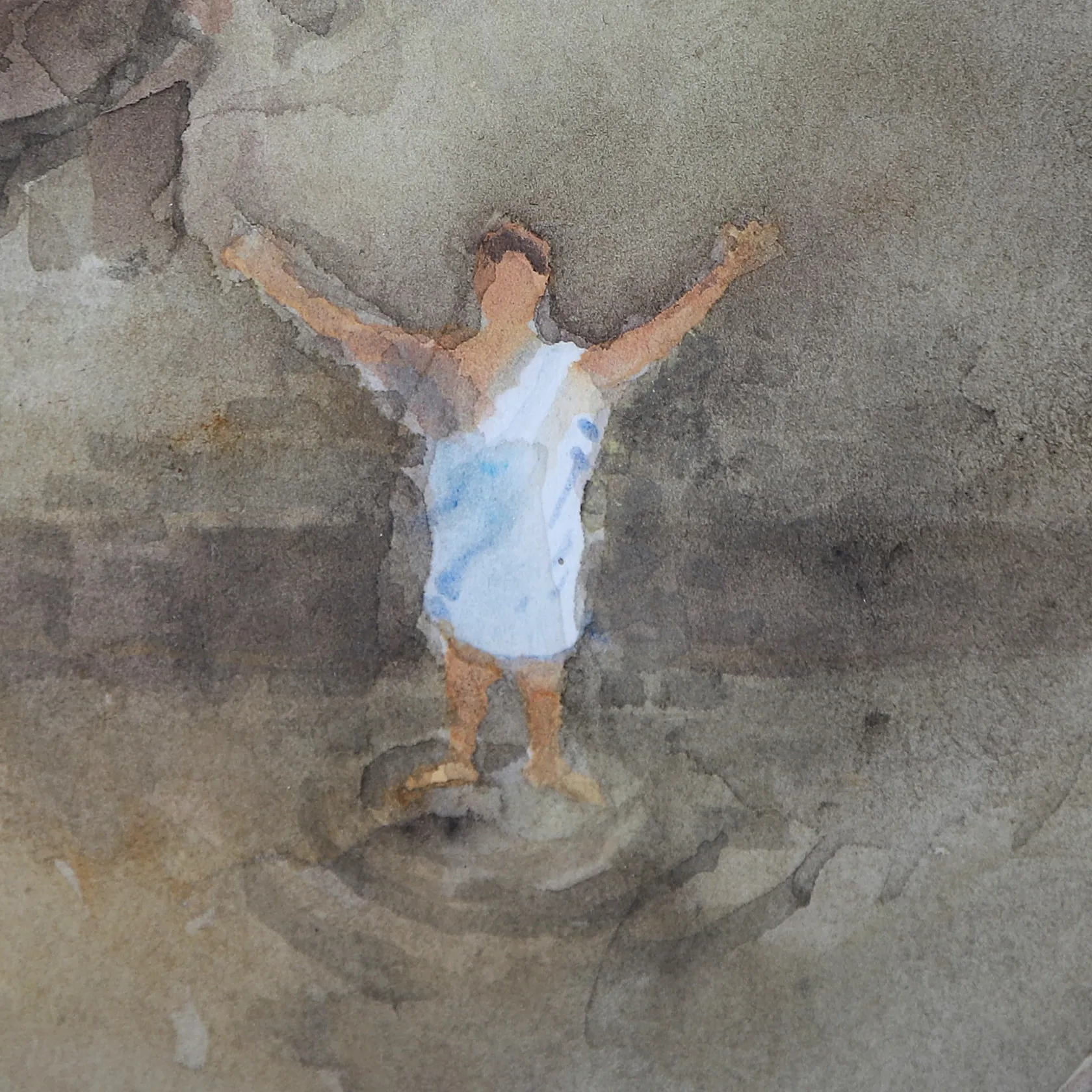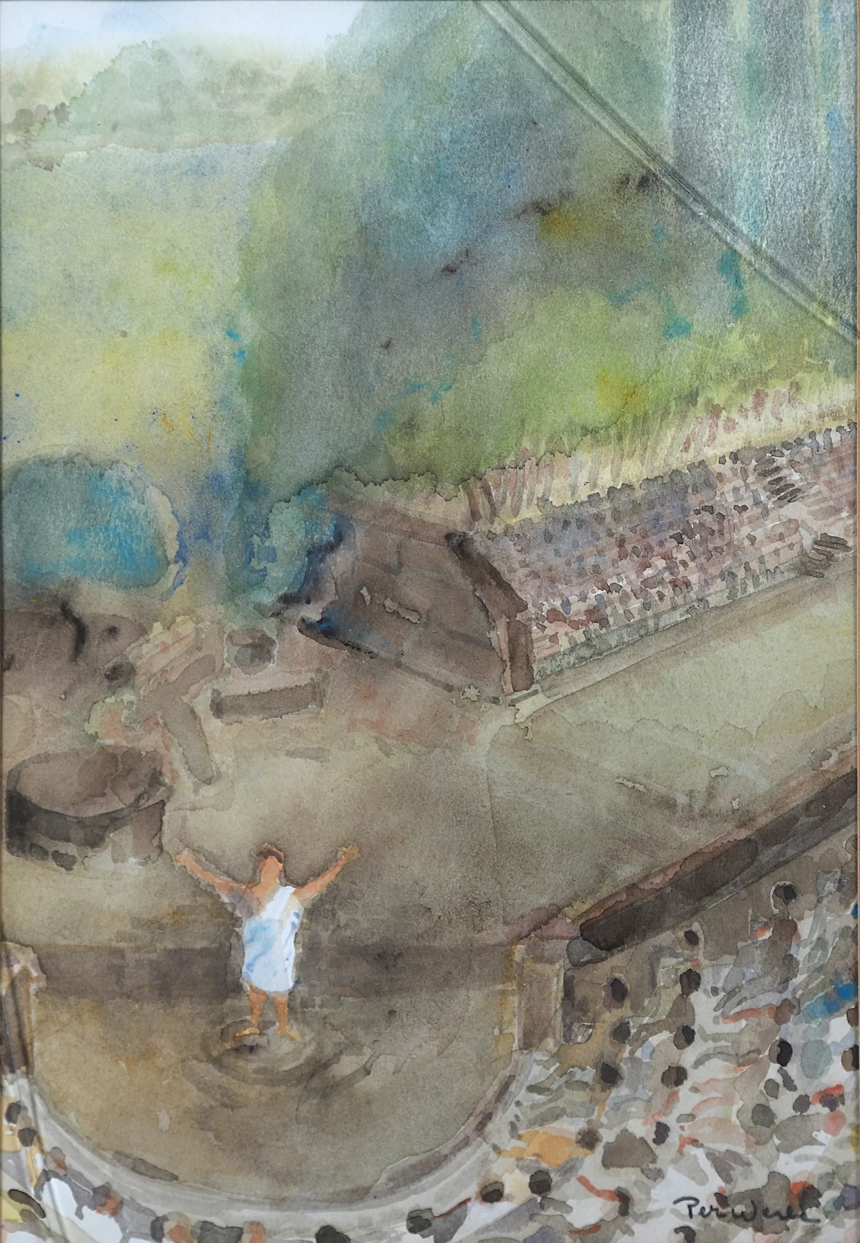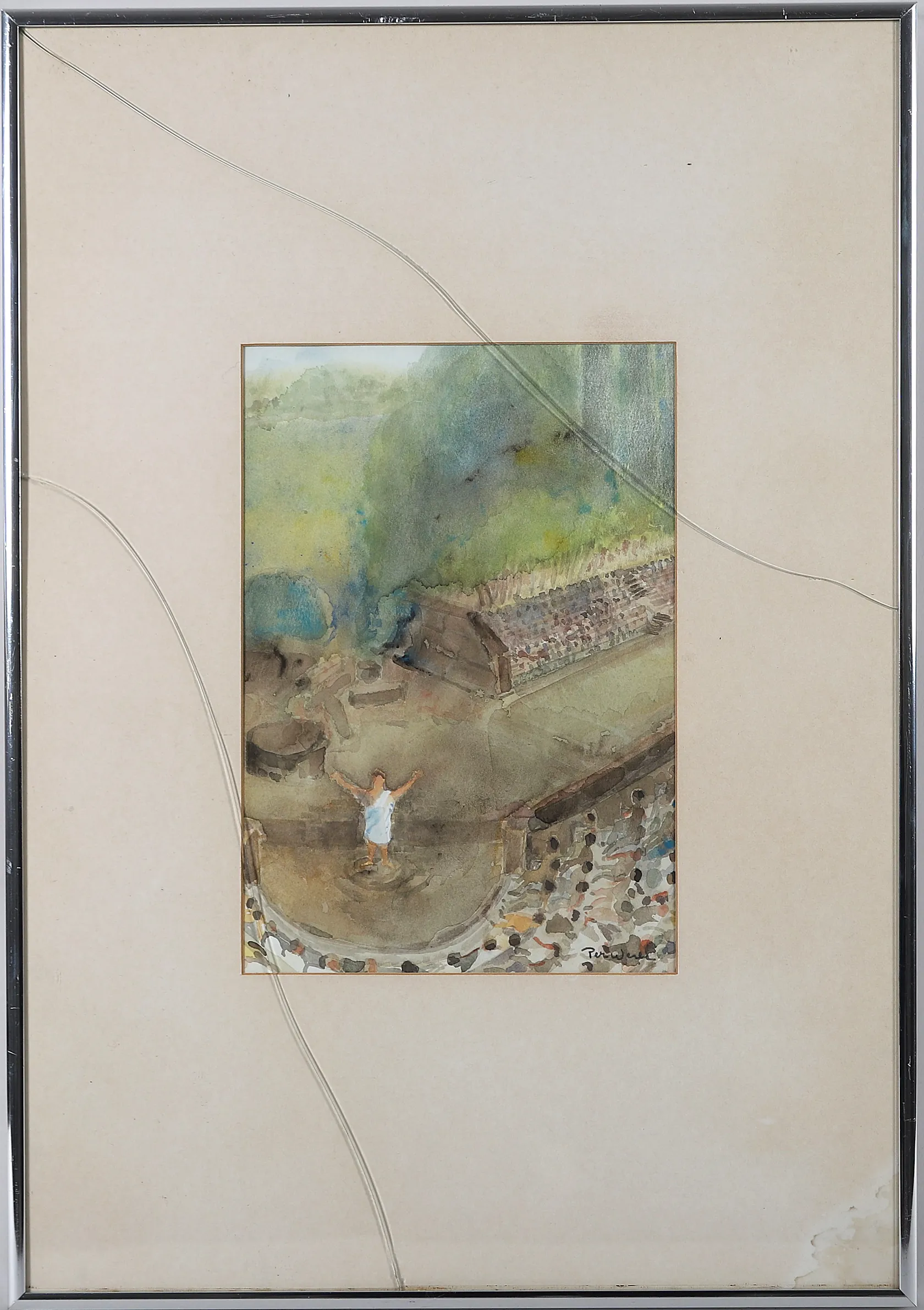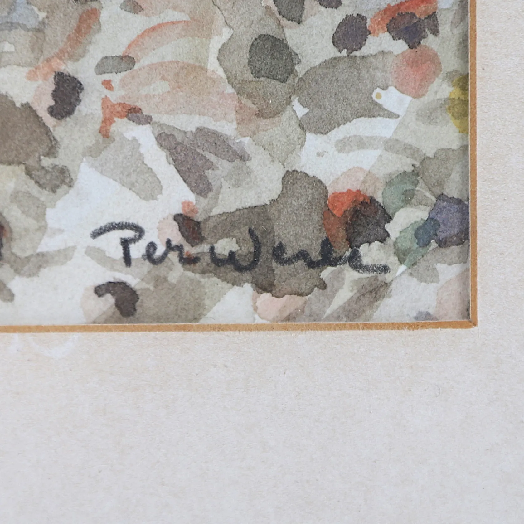 Tavla, akvarell, Per Werle, föreställning, signerad, dagmått, ca 24,5x17cm, ej examinerad ur ram(skadat glas), passepartout gulnad samt med fläckar. Skickas med postpaket. Omfattas av BUS-avgift.