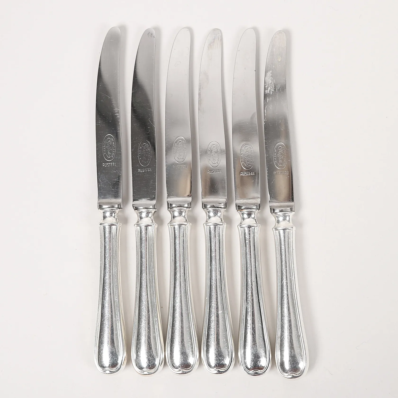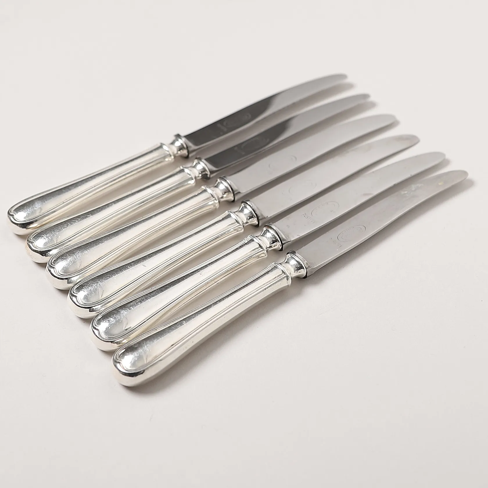 Sex förrättsknivar, Magnus Aase, Bergen, Norge, längd 17,5cm, smärre bruksslitage, silver och stålblad, bruttovikt 261,6g Vikt: 261,6 g.