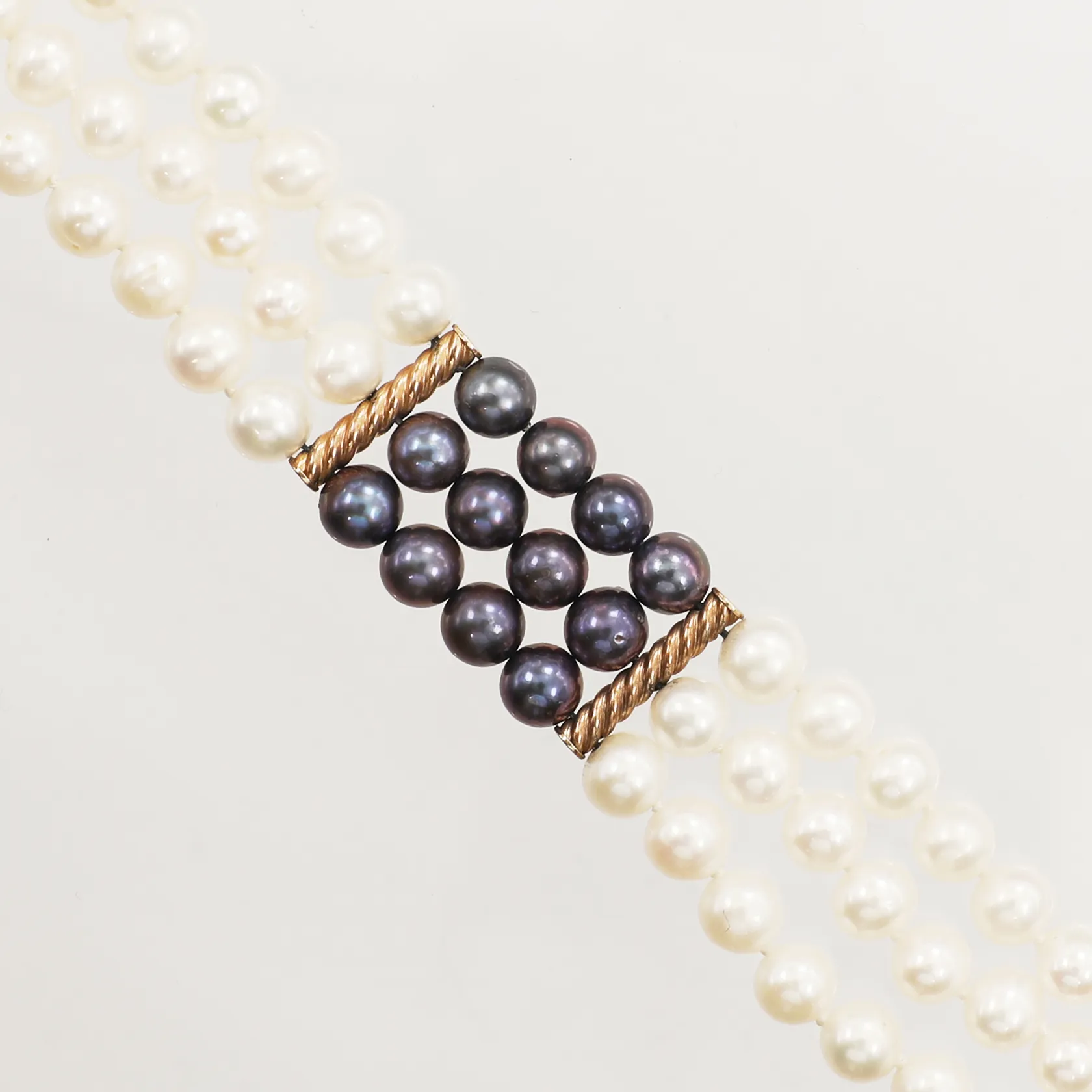 Armband, odlade pärlor, treradigt, ca 62cm, bredd 20mm, lås i 14K, bruttovikt: 28,6g