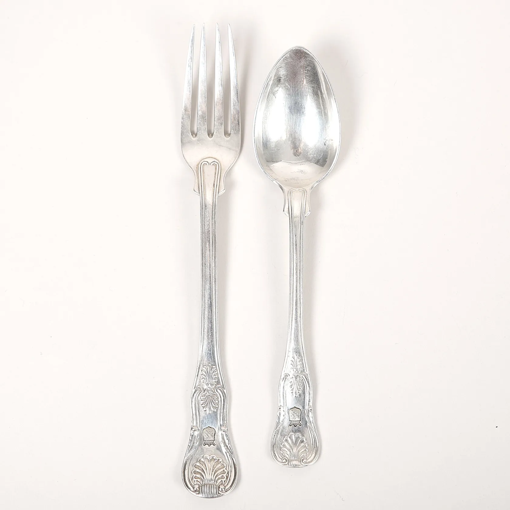 Bordssked och matgaffel med friherrliga ätten Lilliehööks vapen, CG Hallberg Stockholm 1907 respektive Gustaf Möllenborg 1835 Stockholm, längd 28-20,5cm, bruksslitage, silver. Vikt: 116,9 g.