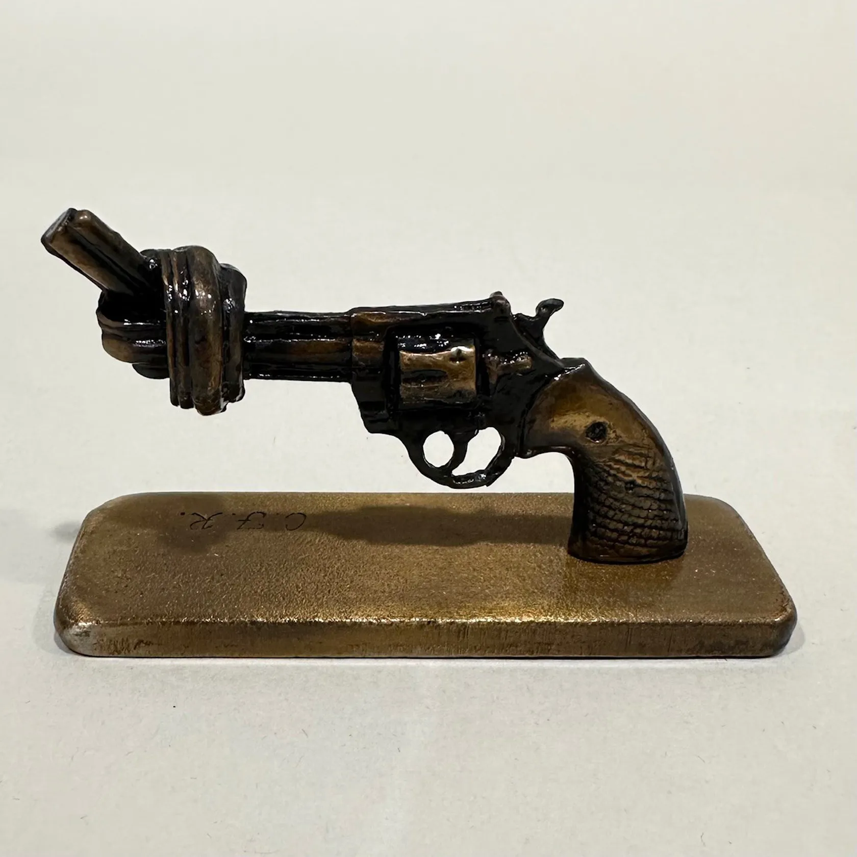 Skulptur, Carl Fredrik Reuterswärd, Non Violence Peace Symbol, längd ca 7cm, höjd 4,5cm, originalförpackning