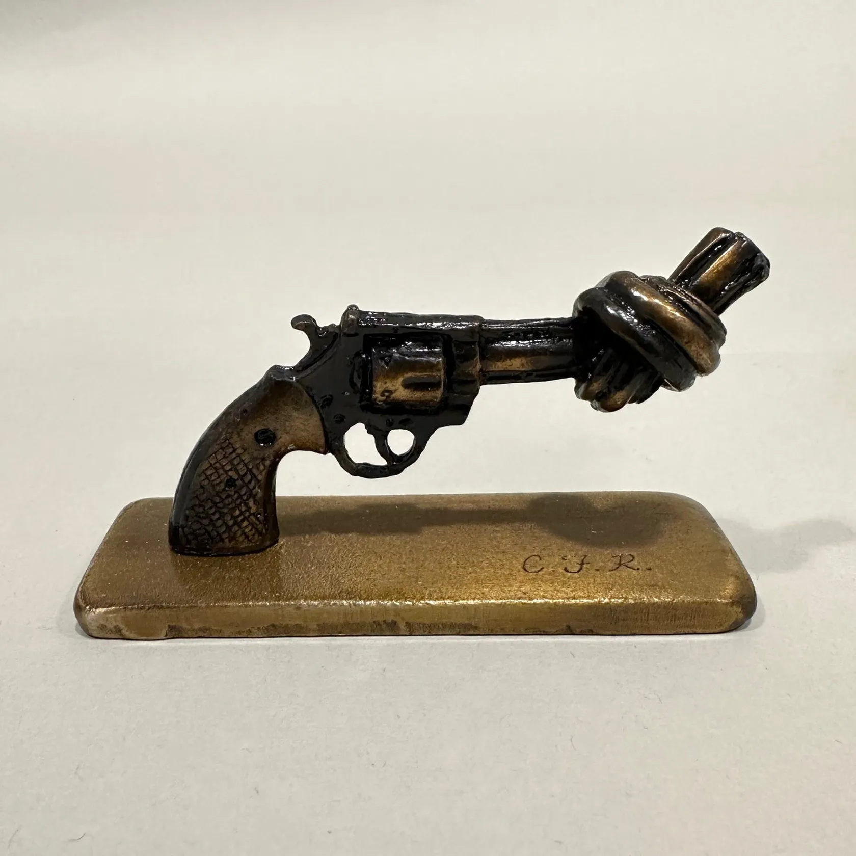Skulptur, Carl Fredrik Reuterswärd, Non Violence Peace Symbol, längd ca 7cm, höjd 4,5cm, originalförpackning