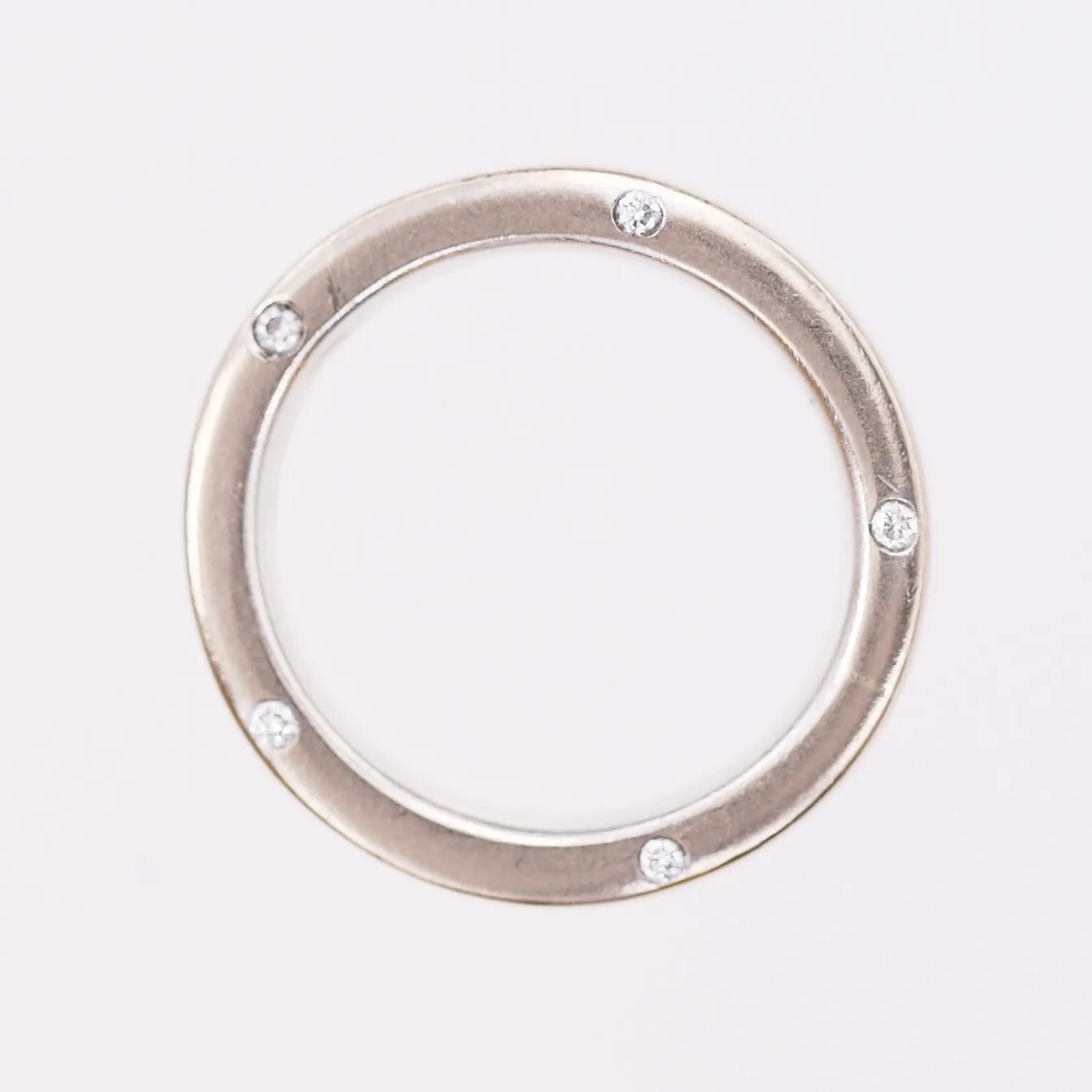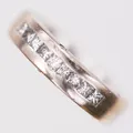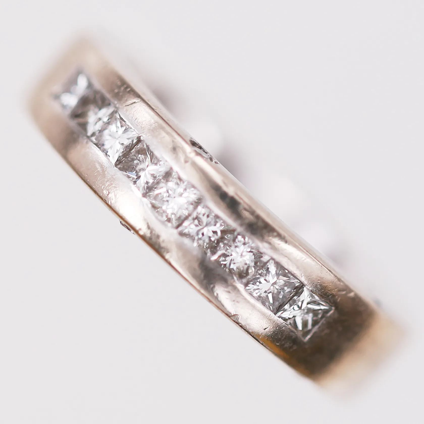Ring, halvallians, med prinsesslipde diamanter 9 x ca 0,05ct, samt briljantslipade sidostenar 10 x ca 0,01ct, en sten krossad, stl: 16, bredd 5mm, personlig gravyr, tillverkad av Schalin, 18K vitguld. Vikt: 10,3 g.