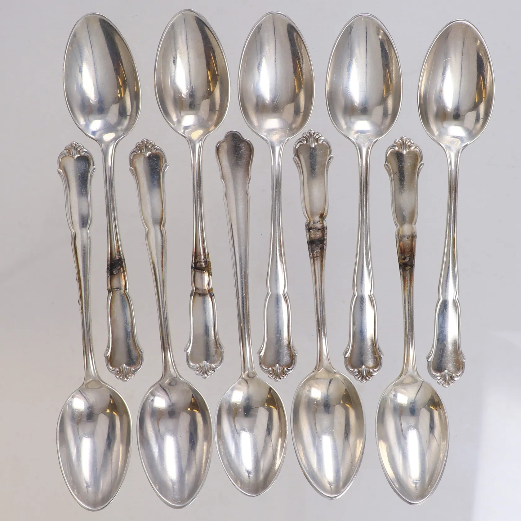 10 Kaffeskedar, längd 11cm, modell Drottning Viktoria, en sked Chippendale, 830/1000 silver Vikt: 110,5 g.