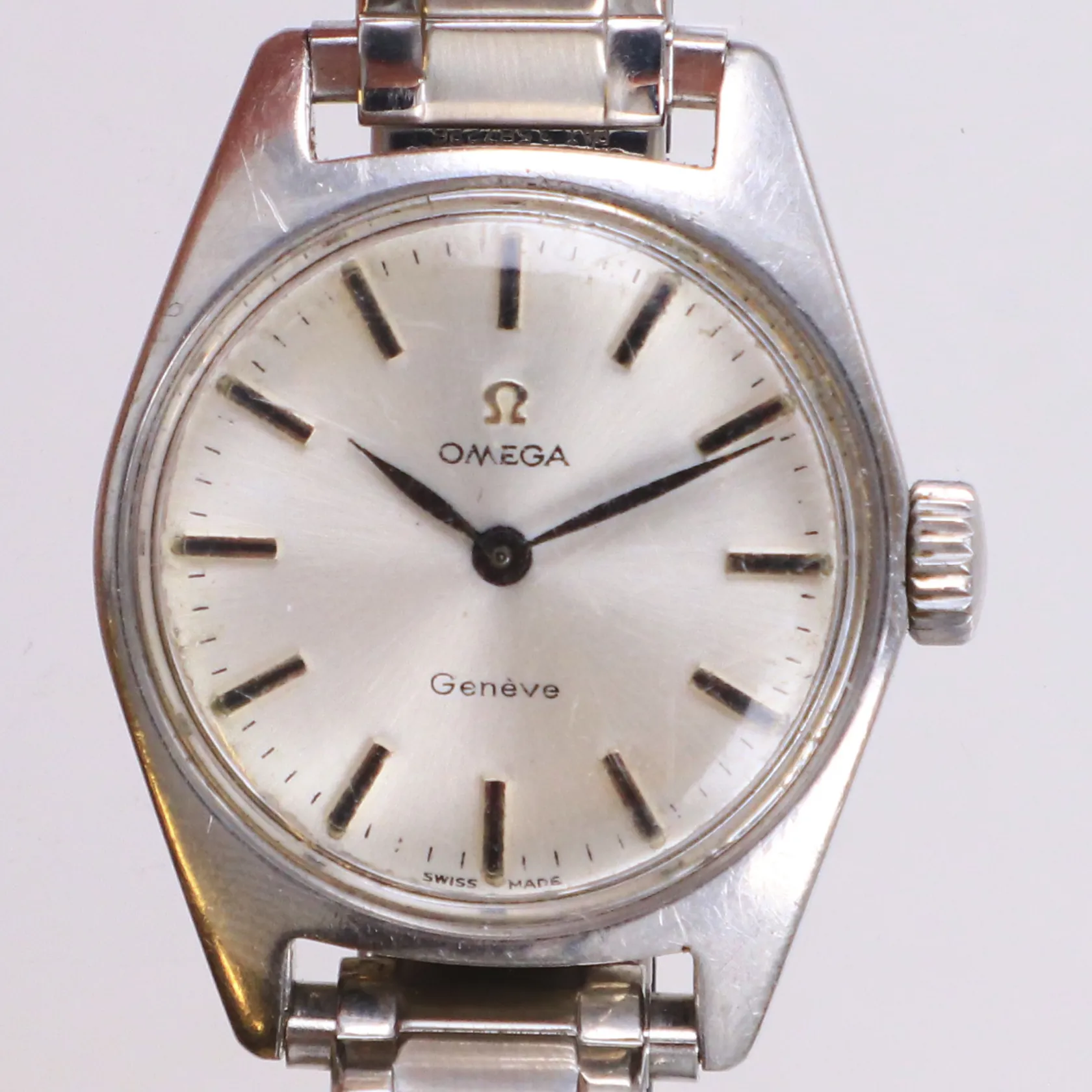 Damur Omega Genéve stål, manuell, 24,5mm, serienr 31104166, boettnr 535.014, kaliber 630, repor på plexiglas och boett, flexarmband i stål ej original, utbytt krona, inga tillbehör.