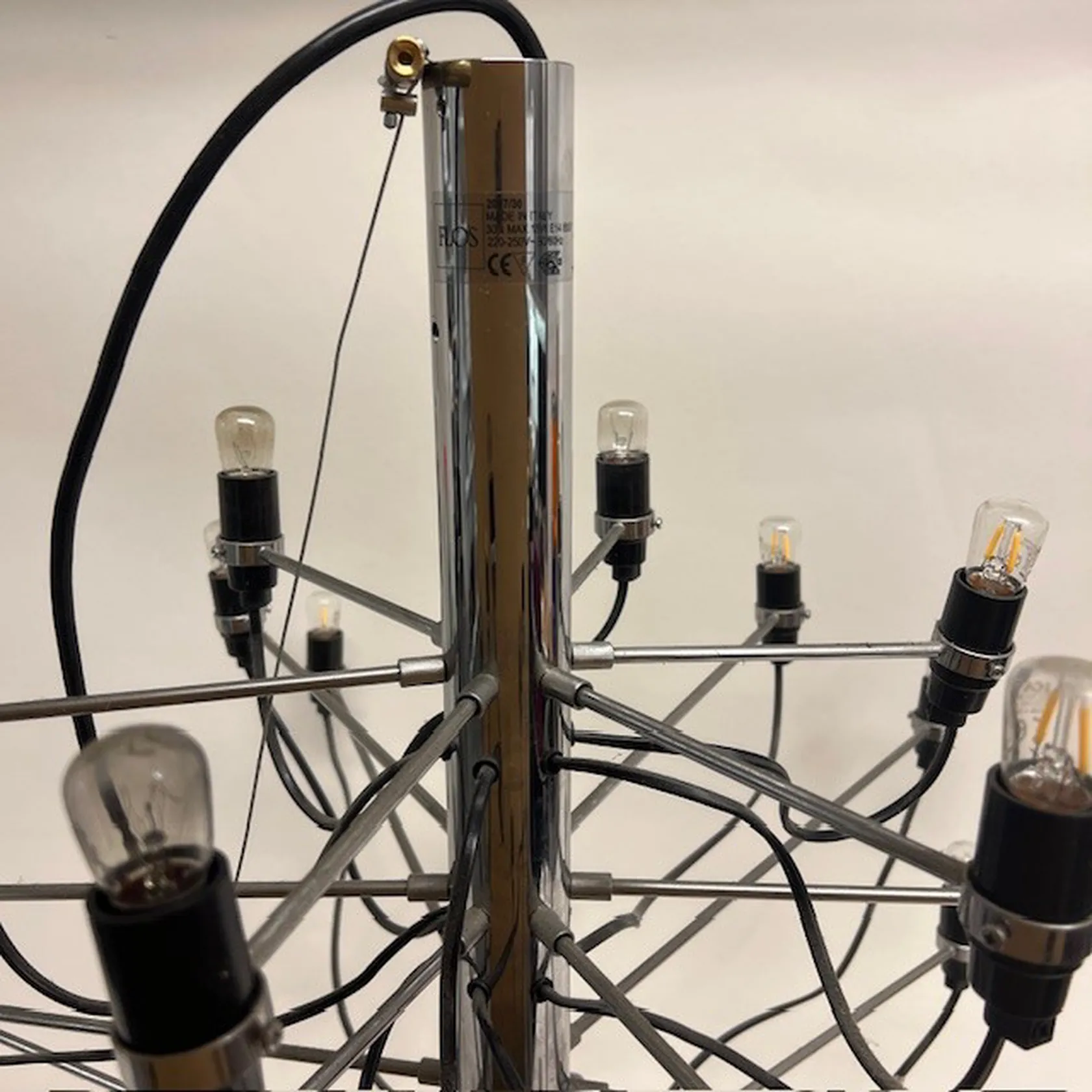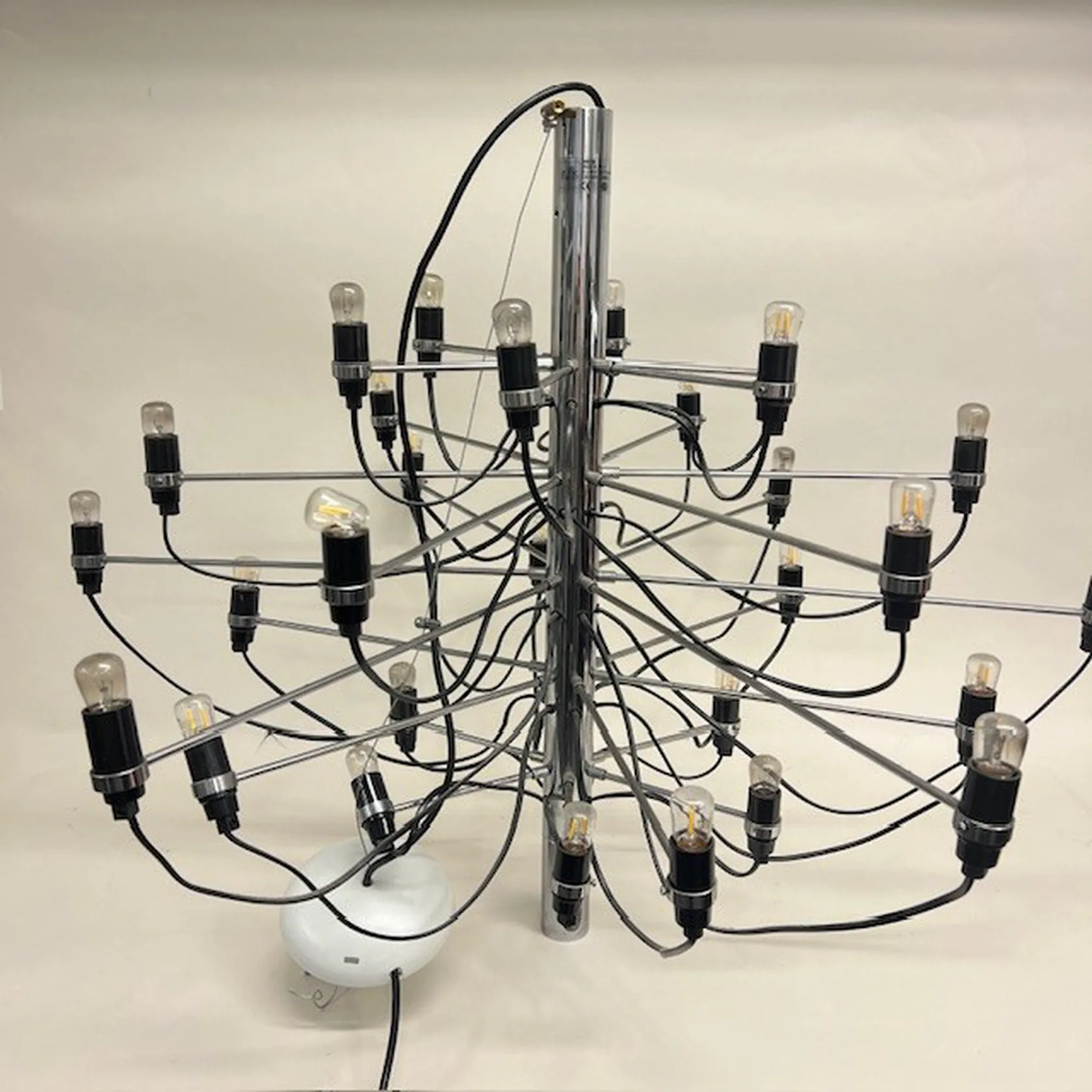 Taklampa Flos Gino Sarfatti Italien, 2097/30, 30 ljuspunkter, höjd 74cm, Ø110cm, en glödlampa defekt/av, i behov av ny elkabel, ej funktionstestad, SKICKAS EJ! Specialfrakt, kontakta pantbankskontoret för mer information..