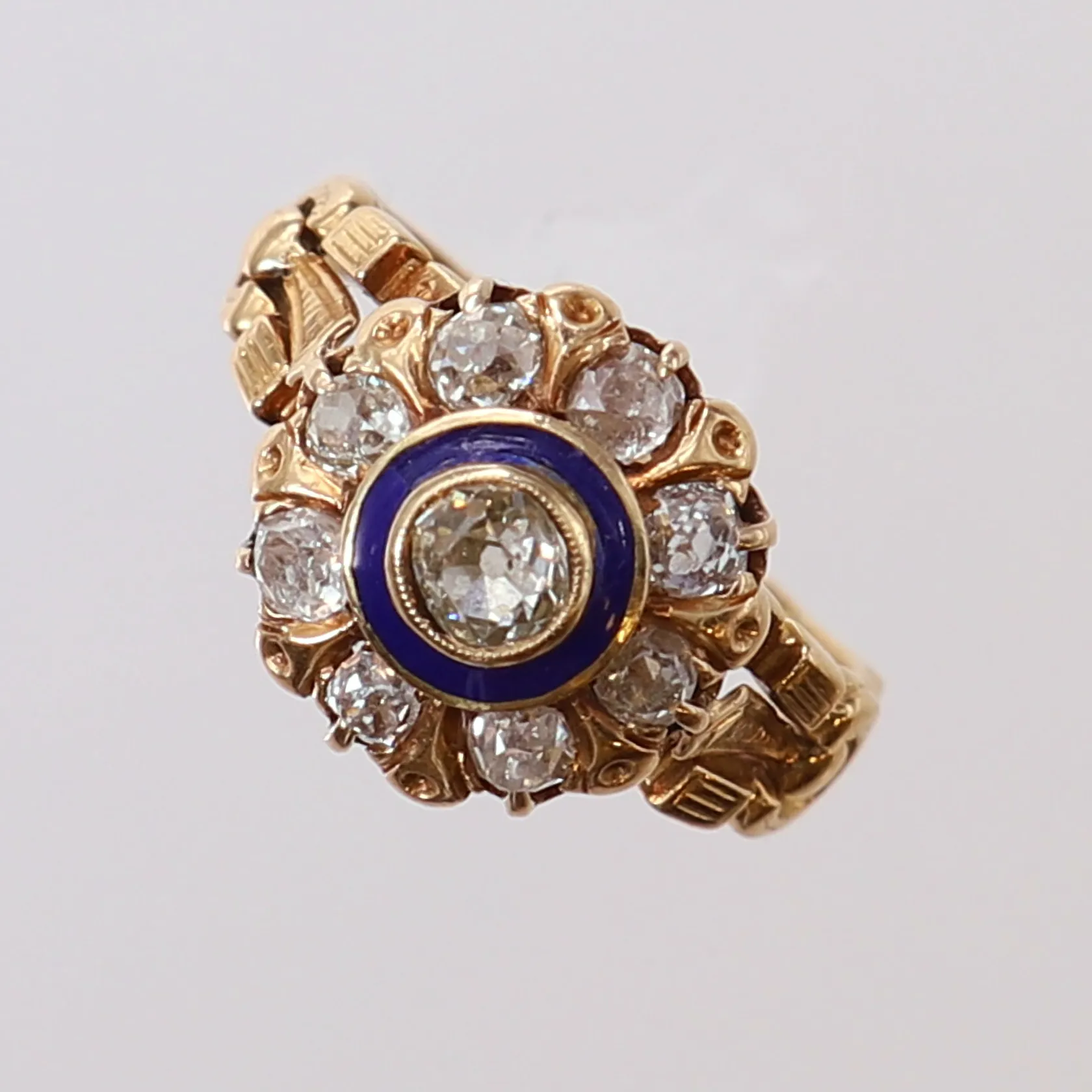 Ring med gammalslipade diamanter 1 x ca 0,25ct, 8 x ca 0,05ct, blå emalj, stl:16¾, bredd 1,5-12,5mm, emaljskador, sprickor i skena. 18K guld. finns för visning på kontoret Östermalm Vikt: 5,2 g.
