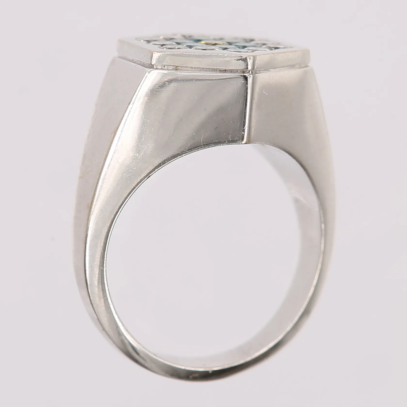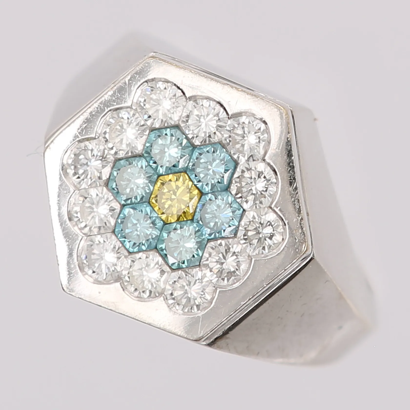 Ring med hexagonslipade diamanter 19 x ca 0,05ct varav en bestrålad gul samt sex bestrålade blå, stl: 17¼, bredd: 3-15mm, saknar stämplar, 18K vitguld. Vikt: 10,9 g.