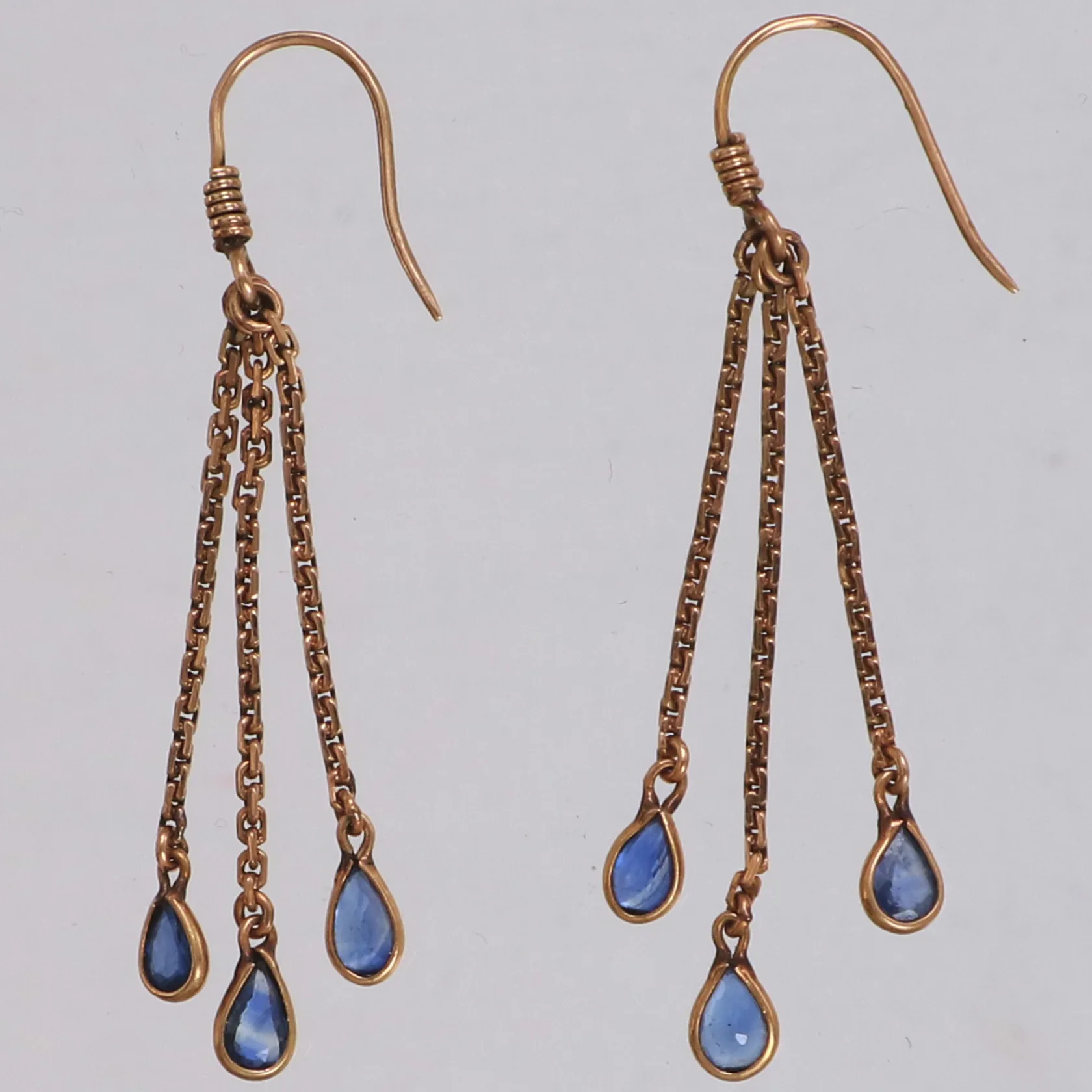 Ett par örhängen med blå stenar, längd 43mm inklusive krokar, bredd 3mm, 14K Vikt: 2,2 g.
