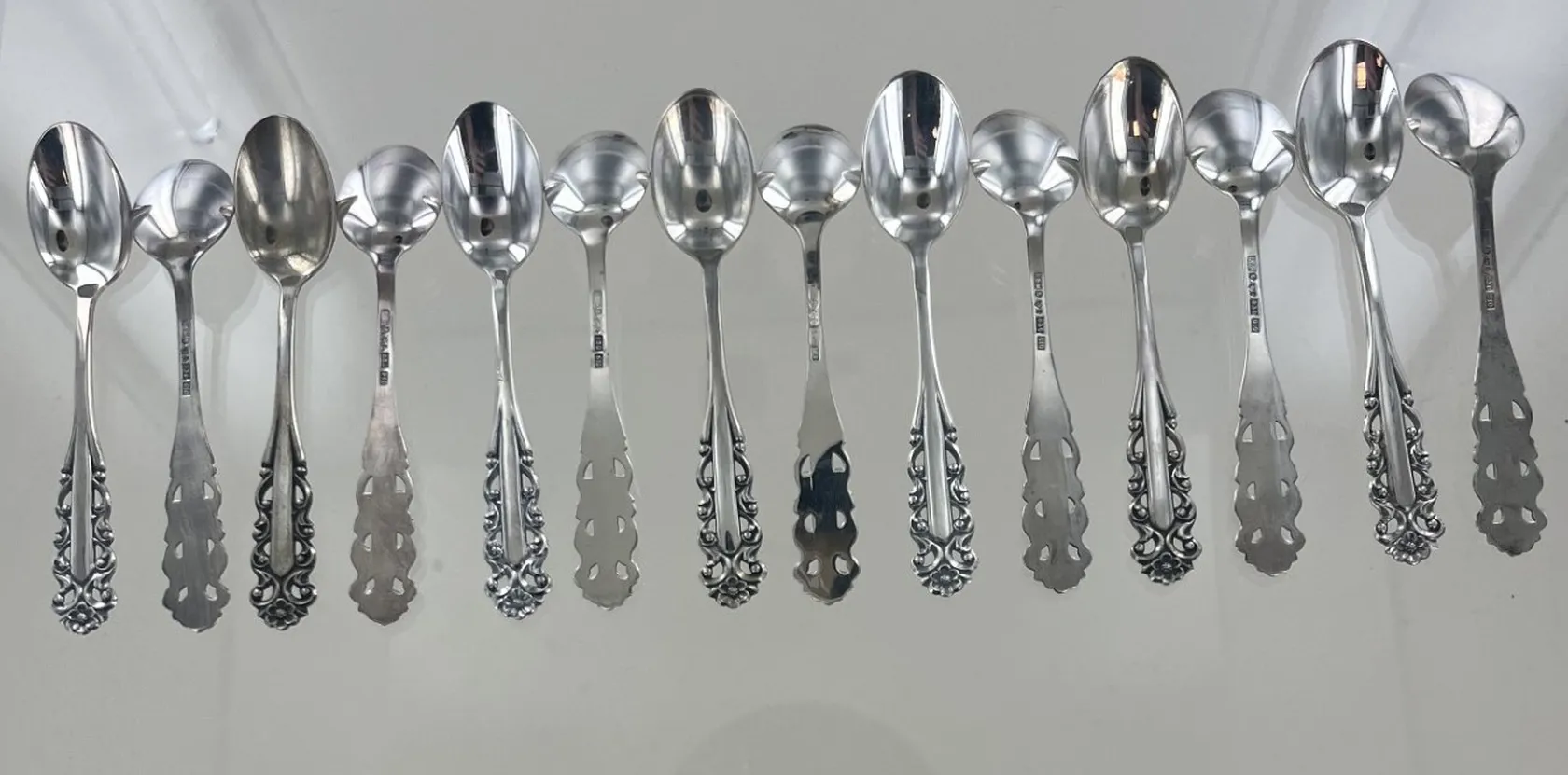 14 skedar, längd 11 cm, silver Vikt: 195,2 g.