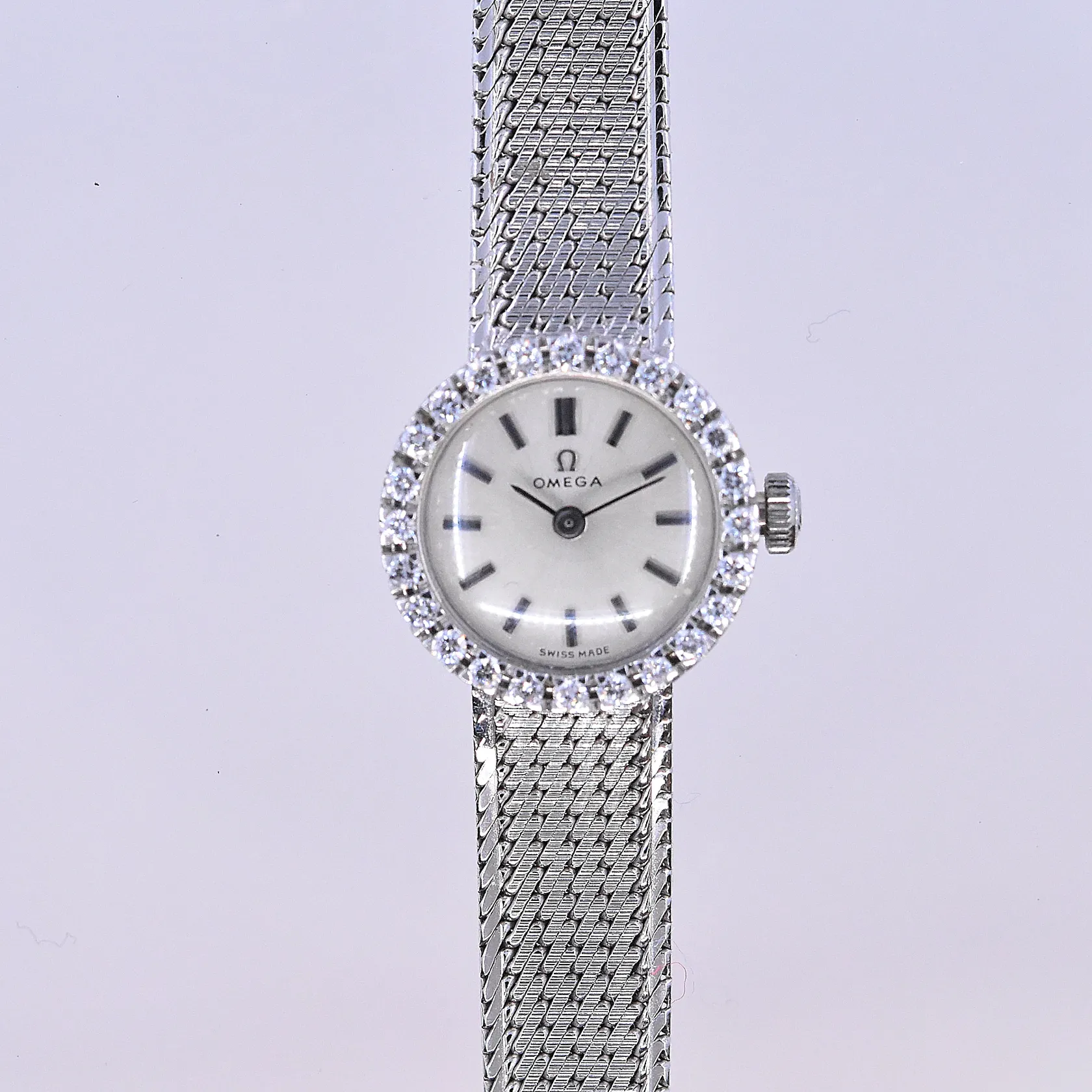 Damur Omega med diamanter i krans 24x0,01ct och integrerad länk, manuell, Ø18 mm, längd 18 cm, bredd länk 10 mm, vitguld, 18K. Bruttovikt 30,9g. Vikt: 30,9 g.